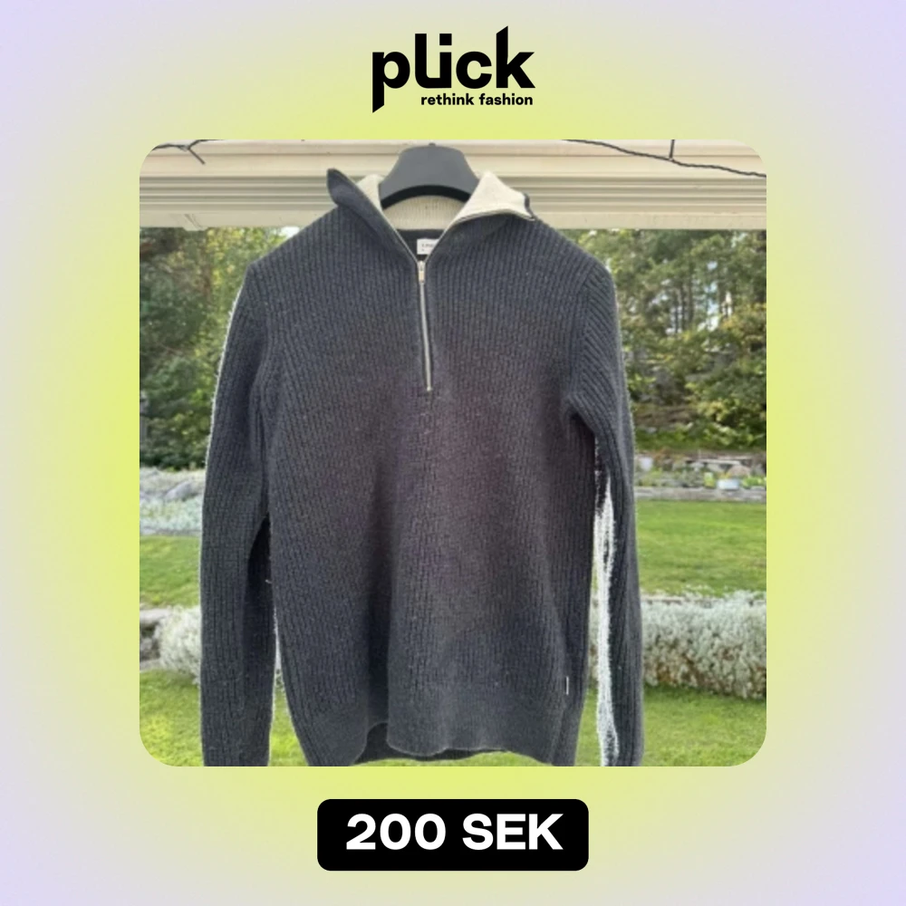 Fin mörkblå/grå stickad halfzip tröja med vit inner krage, storlek S men passar även M. Tröjan är i bra skick, lite nopprig men går att få bort.