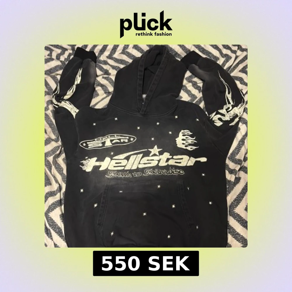 Svart hoodie från Hellstar med stora vita tryck fram och bak, inklusive flames, stjärnor och logga. Hoodien har huva, känguruficka och coola detaljer på ärmarna. Perfekt för dig som gillar streetwear med unik design.