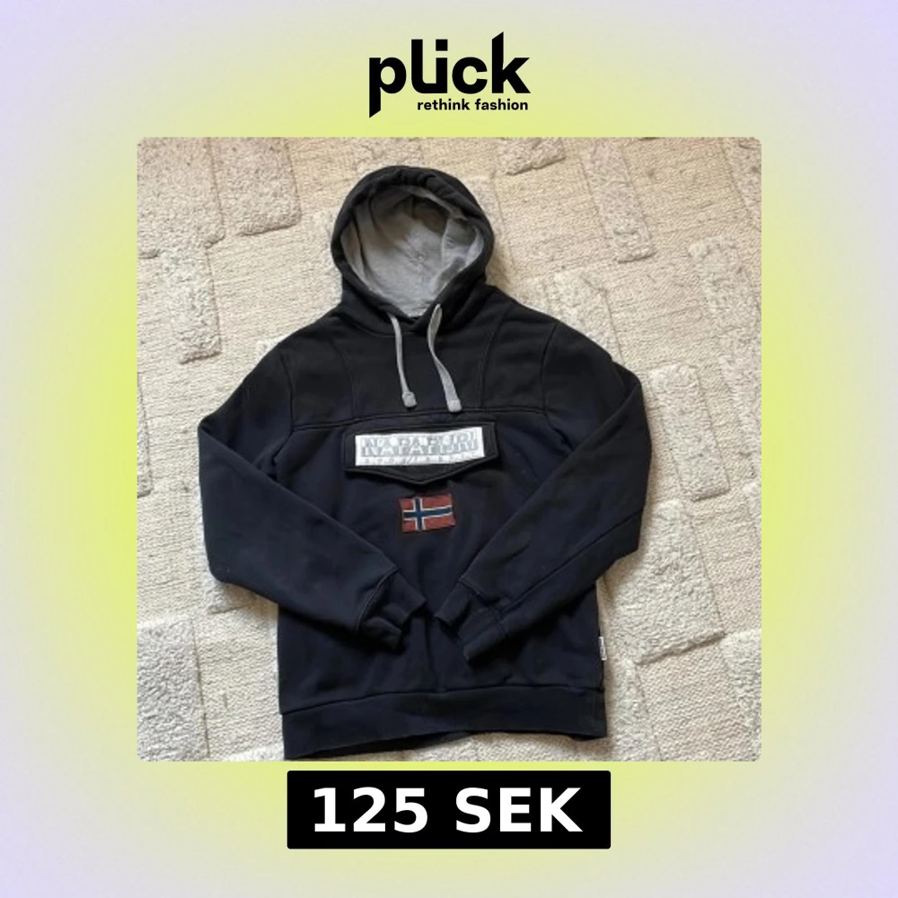 Säljer en svart hoodie från Napapijri med grå insida på huvan och justerbara snören. På bröstet finns en stor ficka med Napapijri-logga och en norsk flagga. Perfekt för en avslappnad och snygg stil.