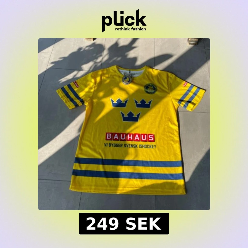 Gul Tre Kronor hockeytröja med blå detaljer, nummer 18 på ryggen och Bauhaus-logga. Klassiska tre kronor på bröstet och Svenska Ishockeyförbundets emblem. Korta ärmar med blå ränder, tillverkad i polyester. Perfekt för hockeyfans! Storlek S/M