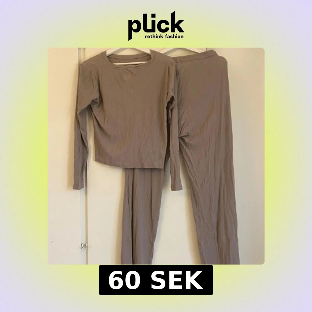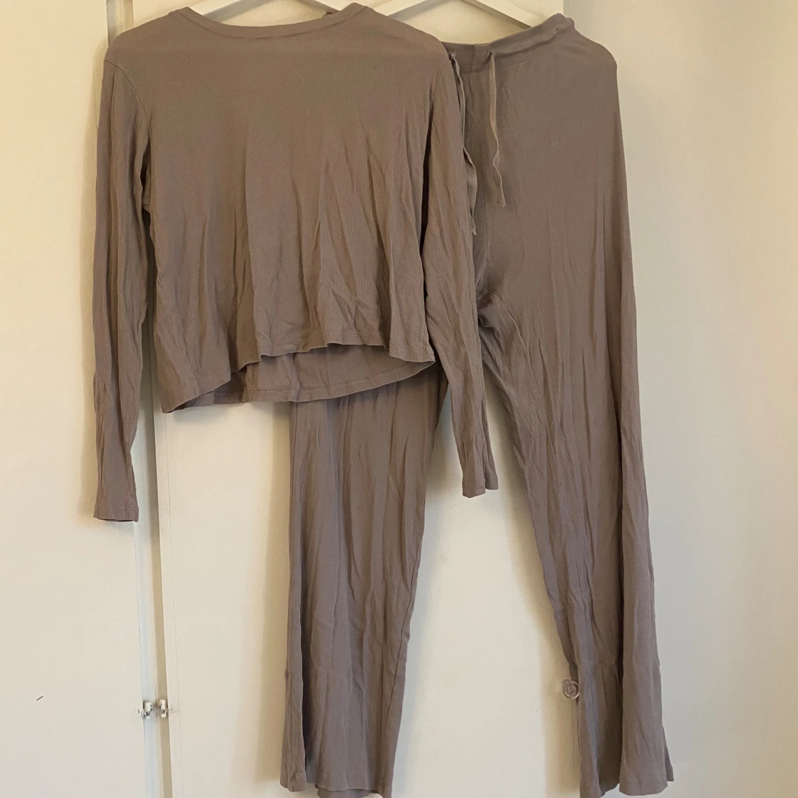 En basic beige långärmad tröja i ribbad bomullsmix och ett par byxor i samma material. Tröjan har rund halsringning och en rak, något lös passform. Byxorna sitter löst och skönt på benen. Materialet är lite urtvättat men passar perfekt till en kväll hemma eller liknande