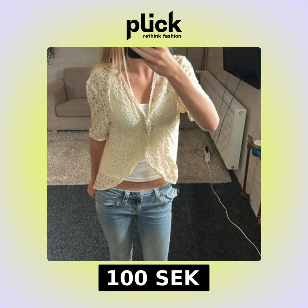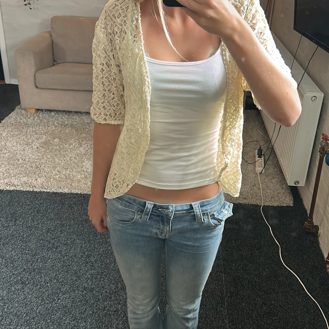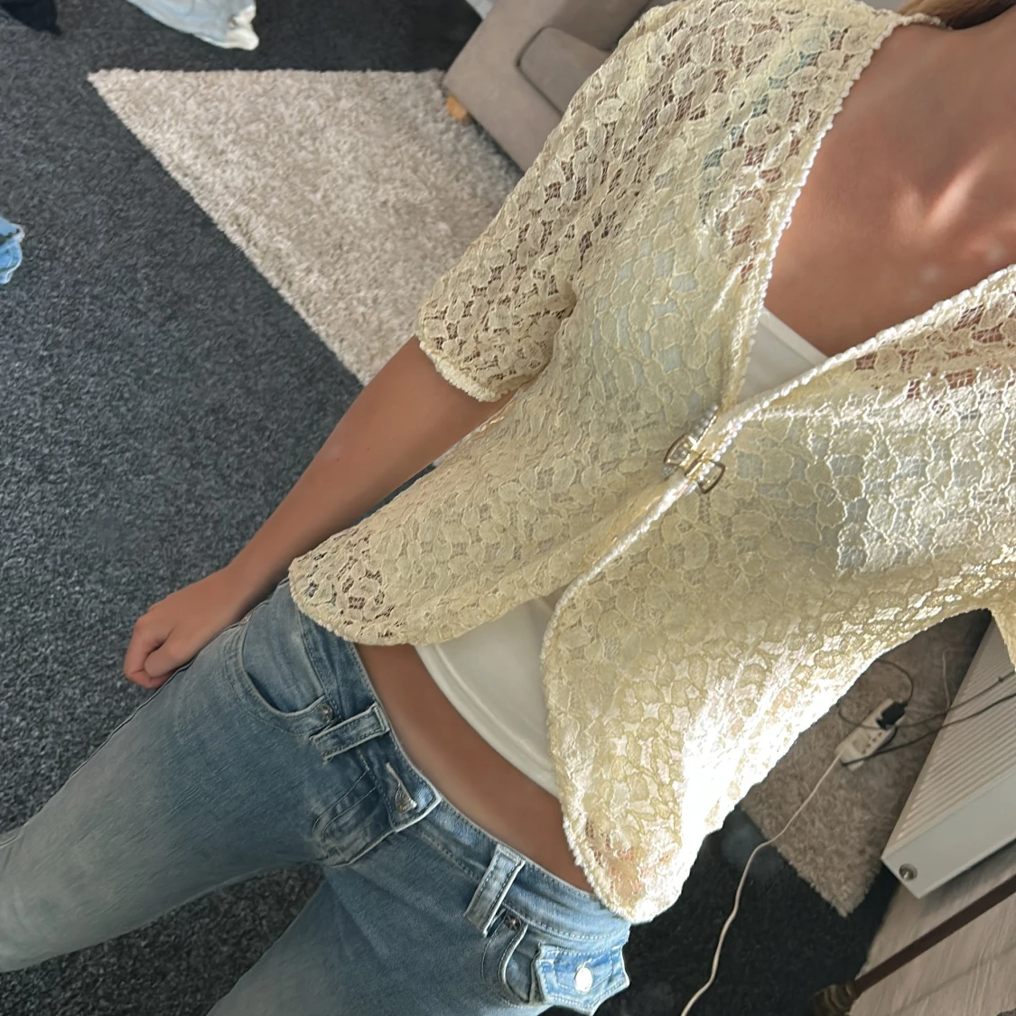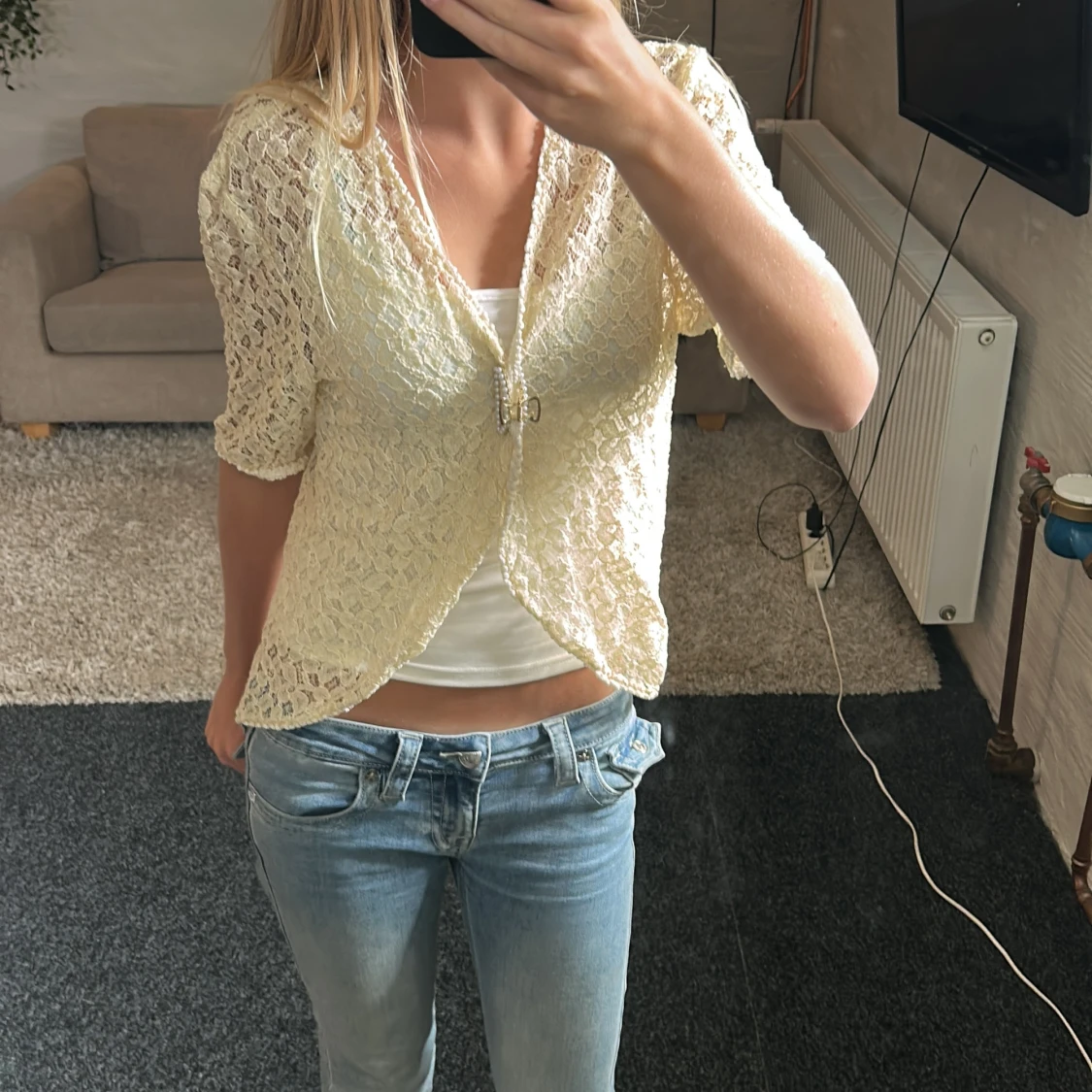 Säljer en superfin beige väst i spets med korta ärmar och v-ringning. Västen har en snygg omlottkänsla framtill och stängs med en liten dekorativ brosch. Perfekt att slänga över ett linne för en söt och trendig look.