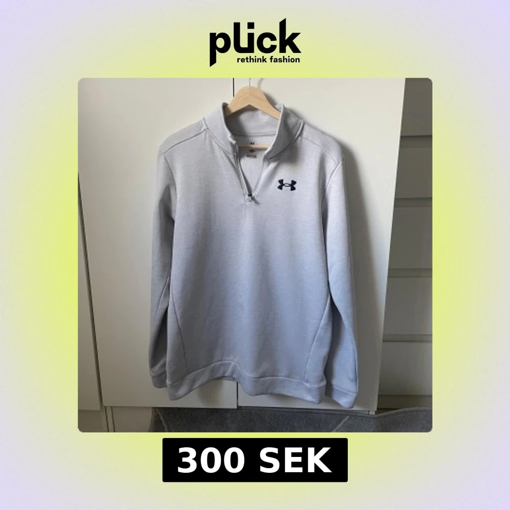 Ljusgrå långärmad tröja från Under Armour med halv dragkedja och hög krage. Tröjan har en svart logga på bröstet och är tillverkad i ett mjukt matrial, den är i storlek XL i junior storlekar vilket motsvarar M/S, tveka inte på stt höra av er😁