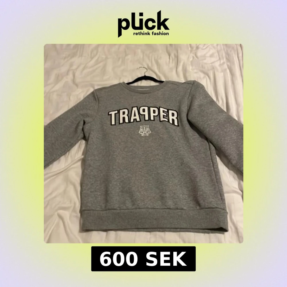 Säljer en grå sweatshirt med texten 'TRAPPER' tryckt på framsidan. Tröjan har långa ärmar och en rund halsringning. Perfekt för en avslappnad stil.