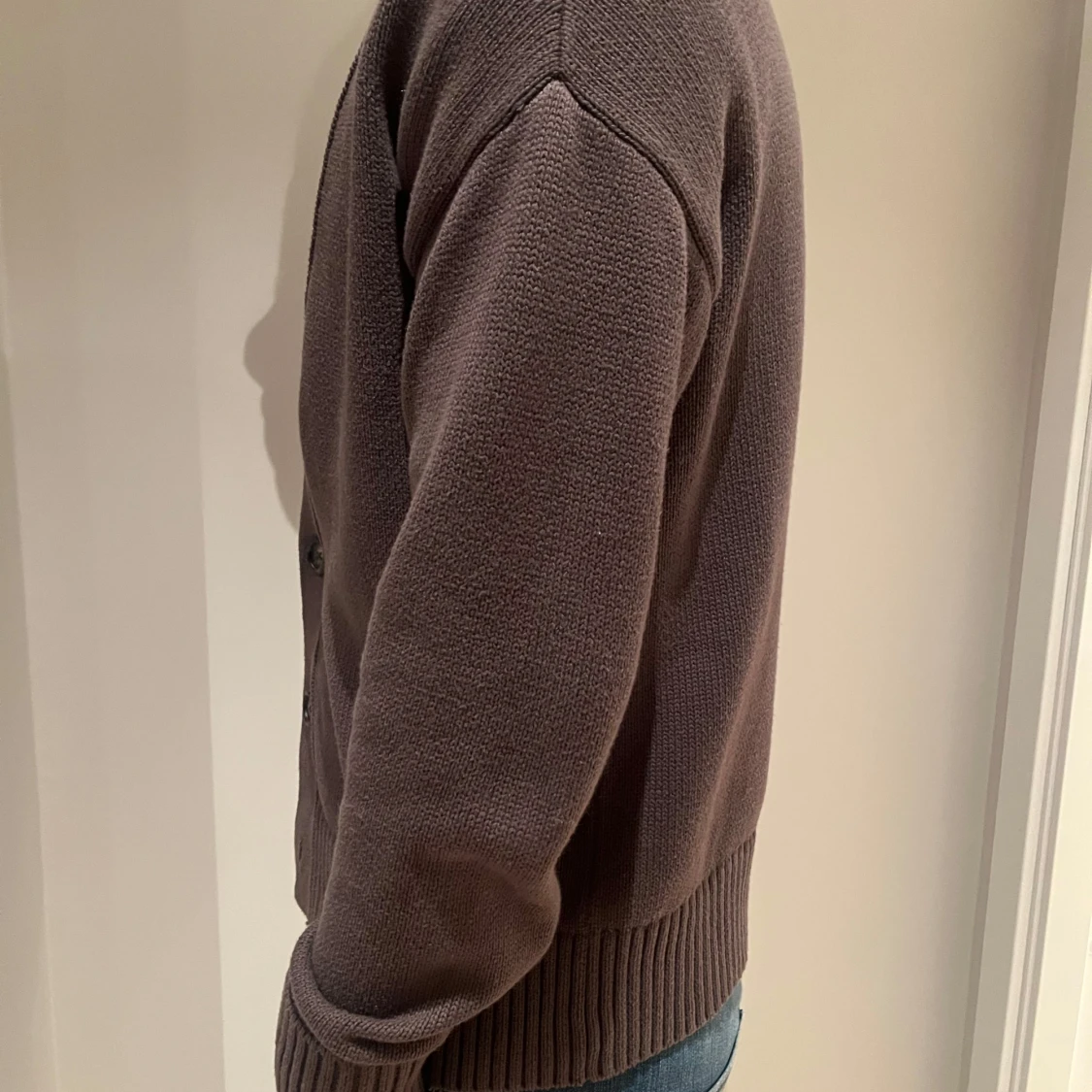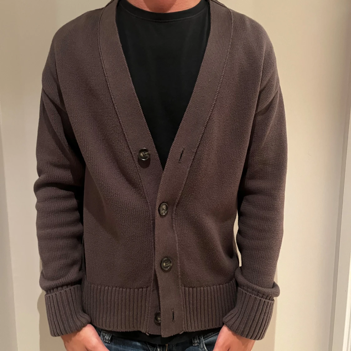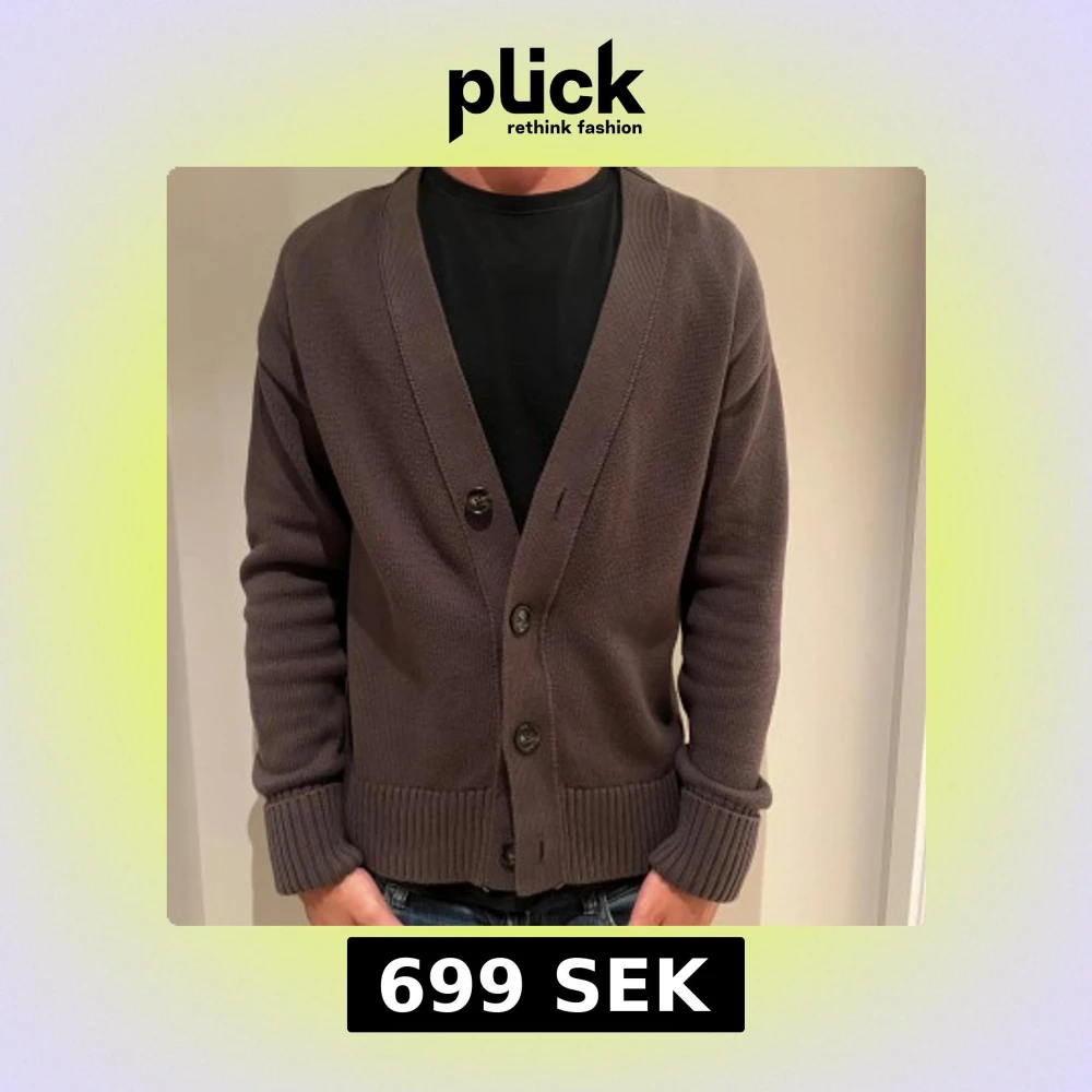 Säljer en brun stickad kofta med djup v-ringning och stora knappar framtill. Koftan har långa ärmar och breda ribbade muddar vid ärmslut och nederkant. Perfekt för lager-på-lager och chill stil. Nästan som ny, passar S/M