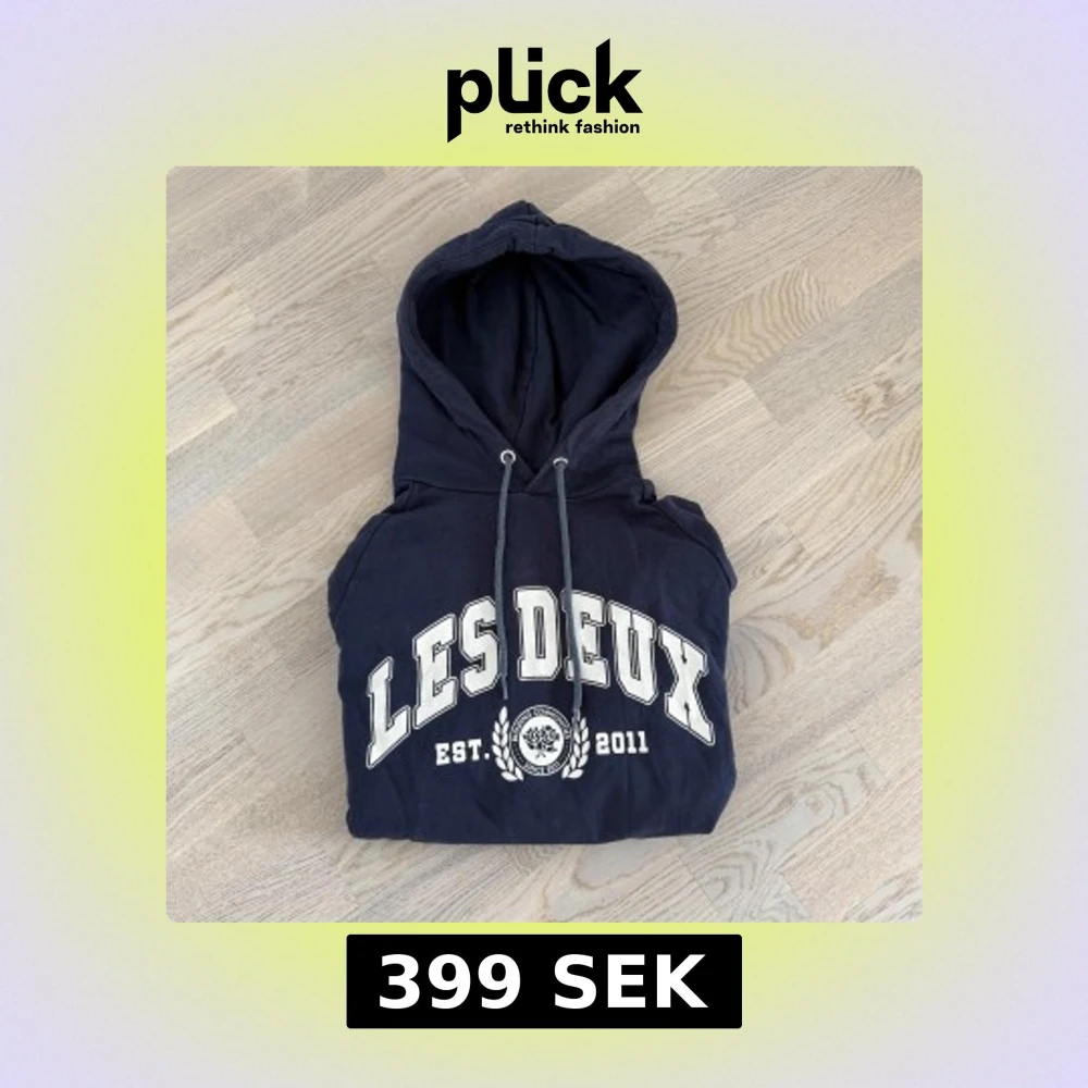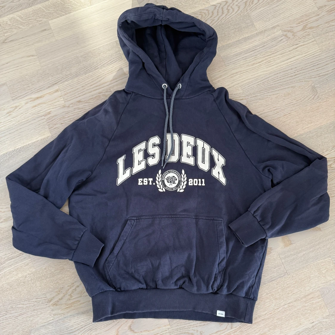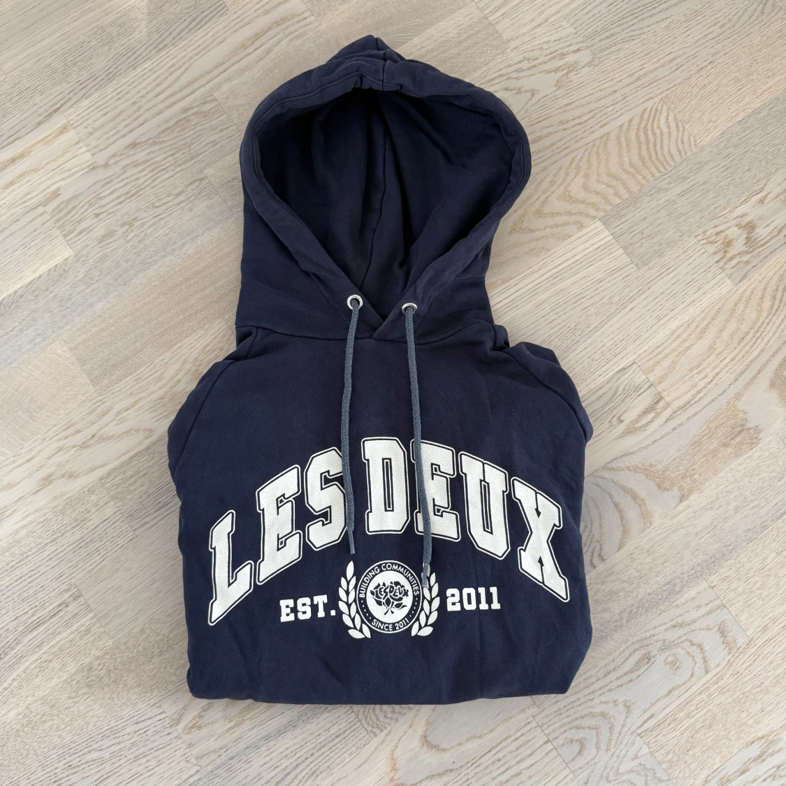 Säljer en mörkblå hoodie från Les Deux med stor vit logotyp och tryck framtill. Tröjan har huva med snörning, ribbade muddar och en klassisk magficka. Perfekt för chill dagar och streetwear-stil. Nypris ca 1000kr, hör av er för frågor!