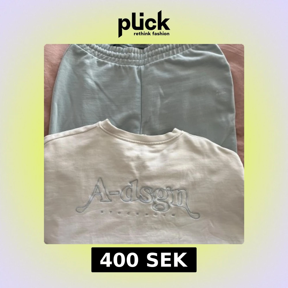Mjukisset från A-dsgn. Sparsamt använda. Ljusblå raka byxor samt en vit sweatshirt med logga på ryggen. Köp hela setet för 400kr eller en del för 250kr. Nypris ca 1500 för hela setet 🫶🏼