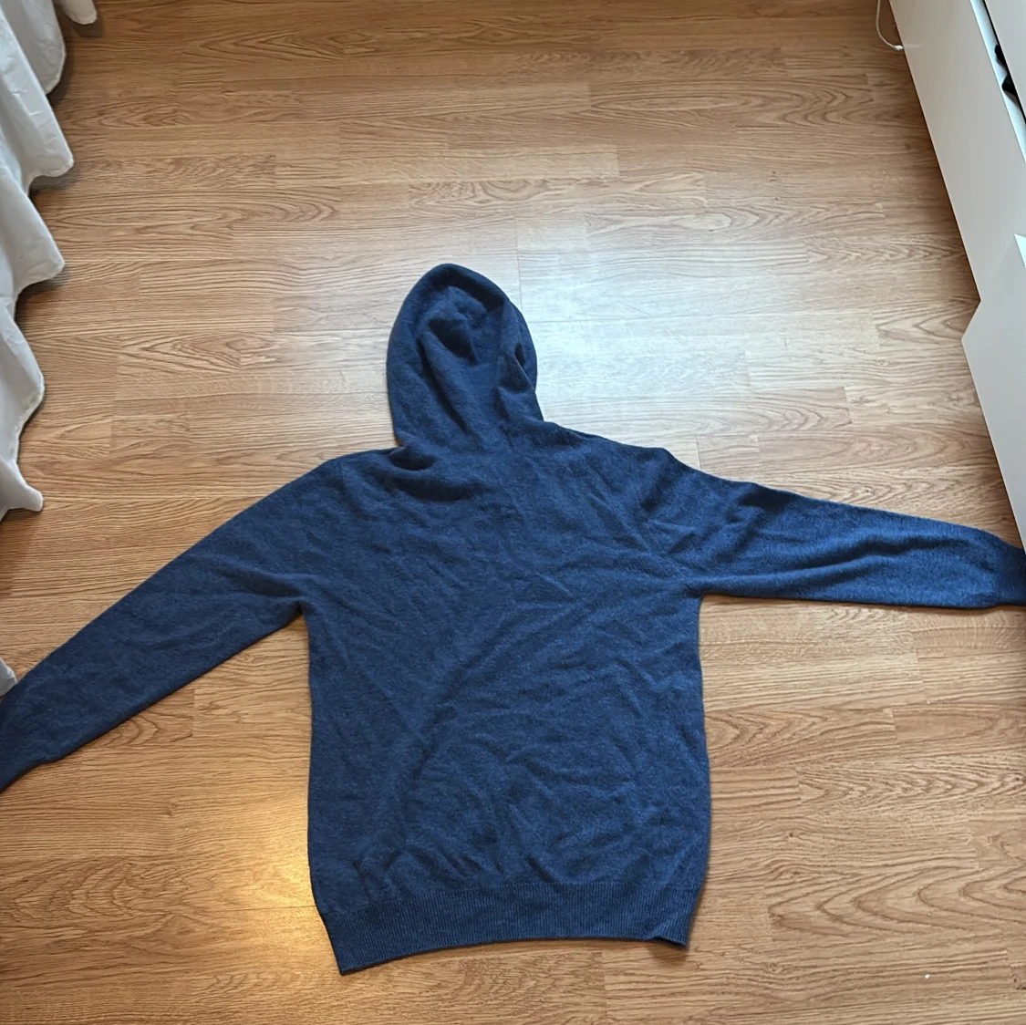 Mysig mörkblå hoodie i mjuk kashmir med långa ärmar och huva. Tröjan har ribbade muddar och dragsko i huvan för en avslappnad look. Perfekt för dig som gillar stilrena och bekväma plagg.
