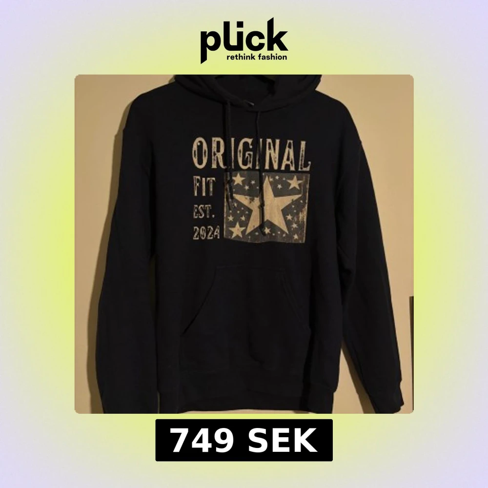 Säljer en mörkblå hoodie från Scndi med tryck framtill som har stjärnor och texten 'ORIGINAL FIT EST. 2024'. Tröjan har huva med snörning och en stor magficka. Väldigt eftertraktad. Perfekt för dig som gillar en avslappnad och cool stil.