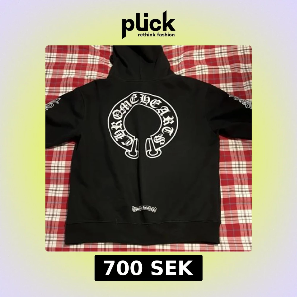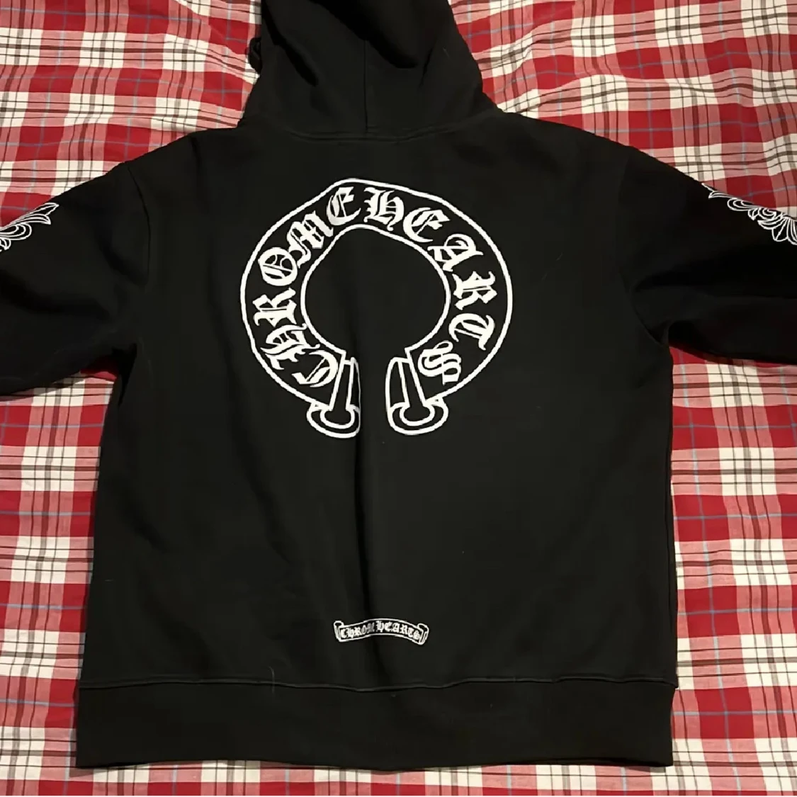Svart hoodie från Chrome Hearts med stor vit logga på ryggen och mindre tryck på bröstet. Dragkedja framtill, snörning i huvan och detaljerade tryck längs ärmarna. Perfekt för dig som gillar streetwear och vill sticka ut.