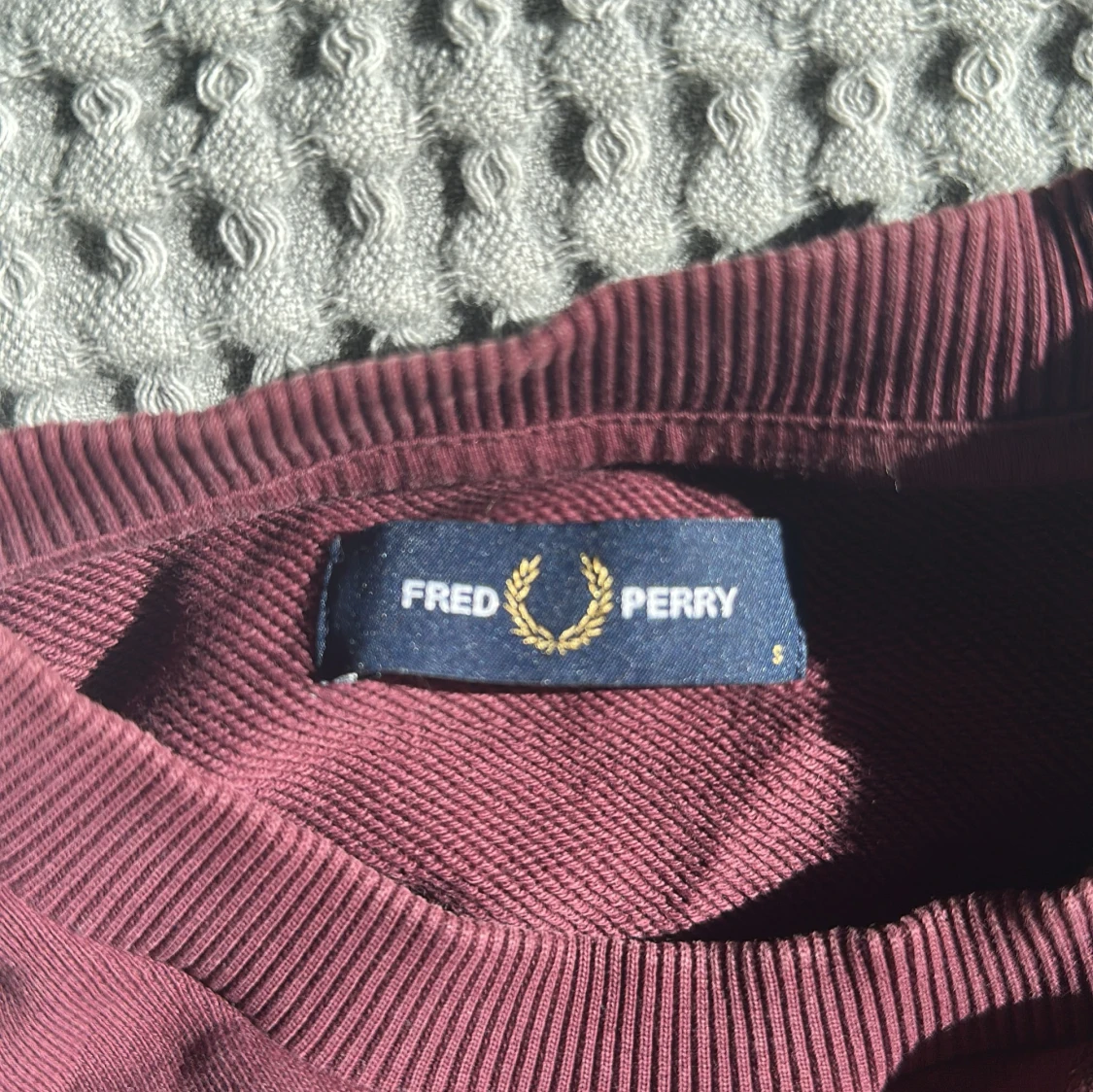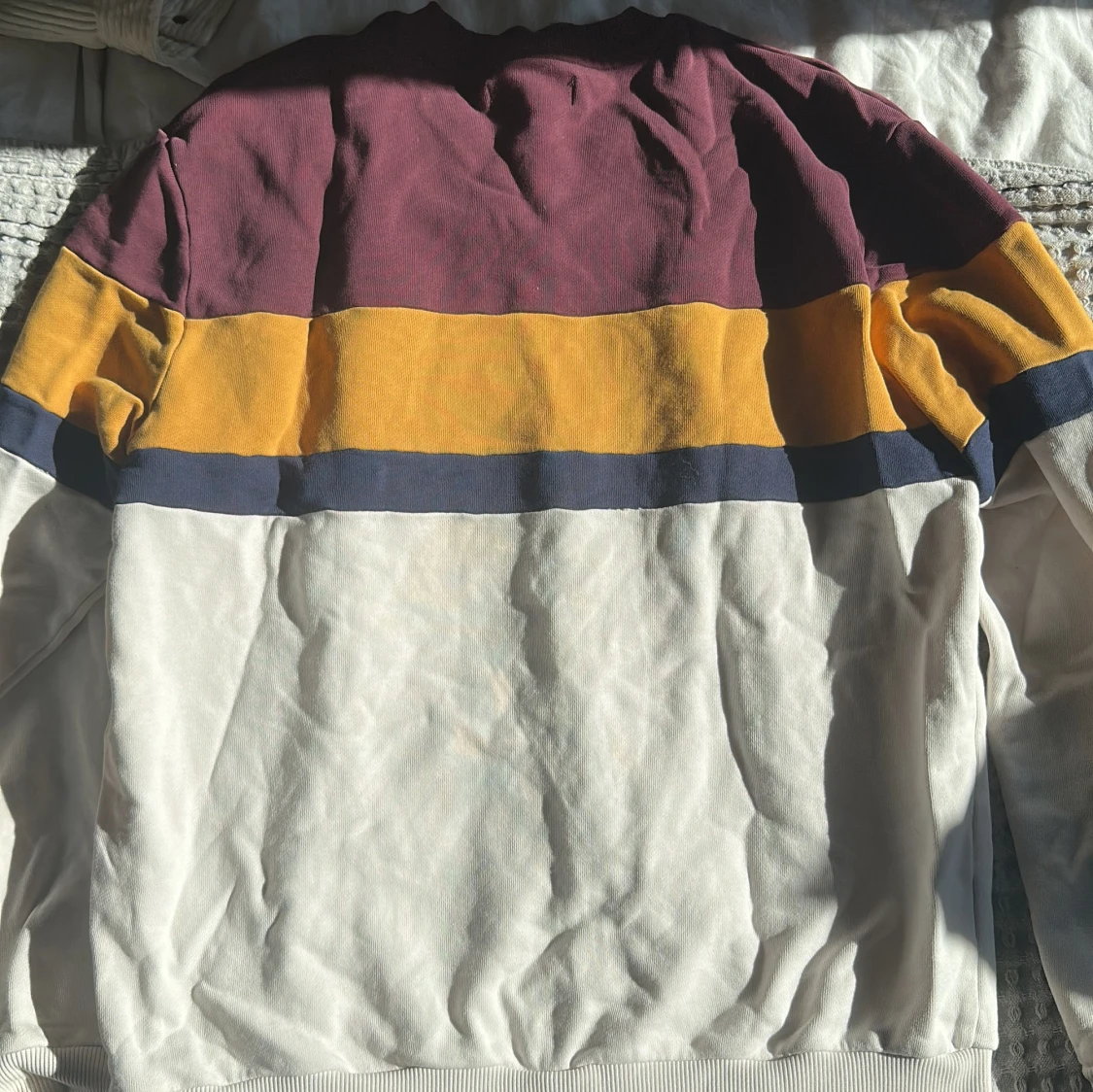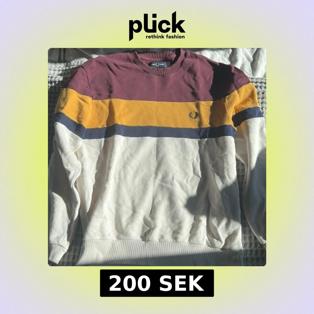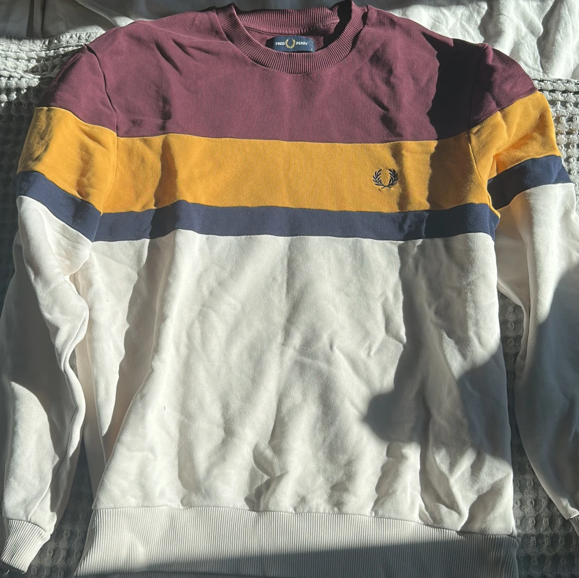 Säljer en snygg randig tröja från Fred Perry i storlek S. Tröjan har breda blockränder i vinrött, gult, marinblått och vitt. Klassisk crewneck med broderad logga på bröstet. Perfekt för dig som gillar streetwear och färgkombos.