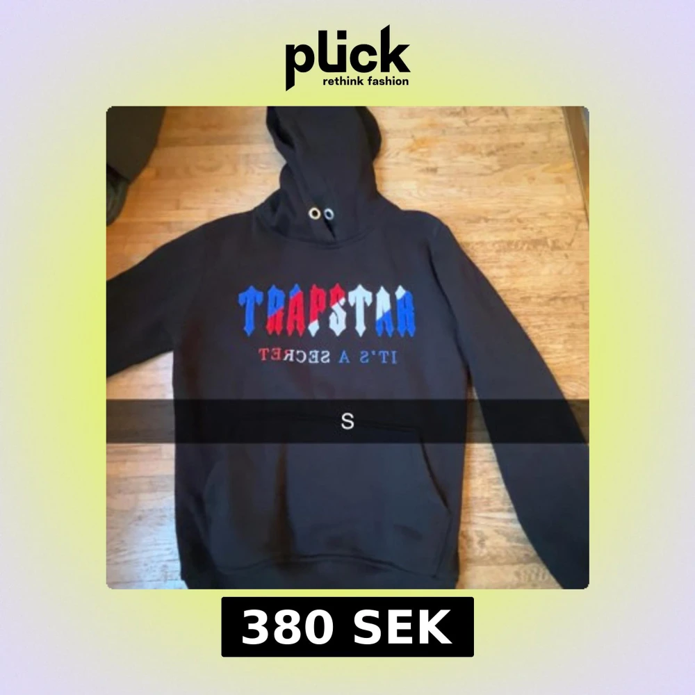 Svart hoodie från Trapstar med stor färgglad logga i blått, rött och vitt på bröstet. Klassisk huva med snörhål och magficka framtill. Perfekt för dig som gillar streetwear och vill sticka ut med coolt tryck.