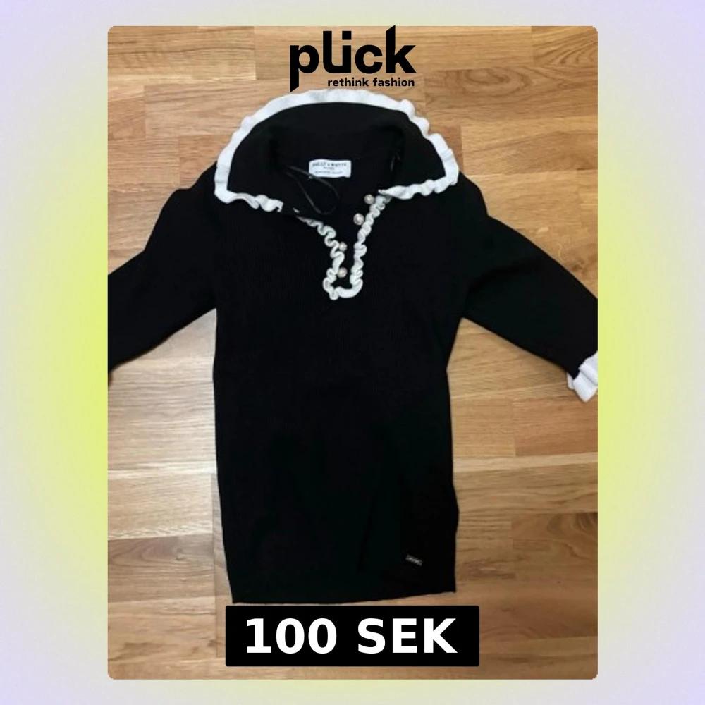 Svart stickad kofta med vit volangkant vid kragen och knäppning med pärlknappar. Långärmad modell med ribbad struktur och vit detalj vid ärmslut. Perfekt för dig som gillar klassiska detaljer med en twist.