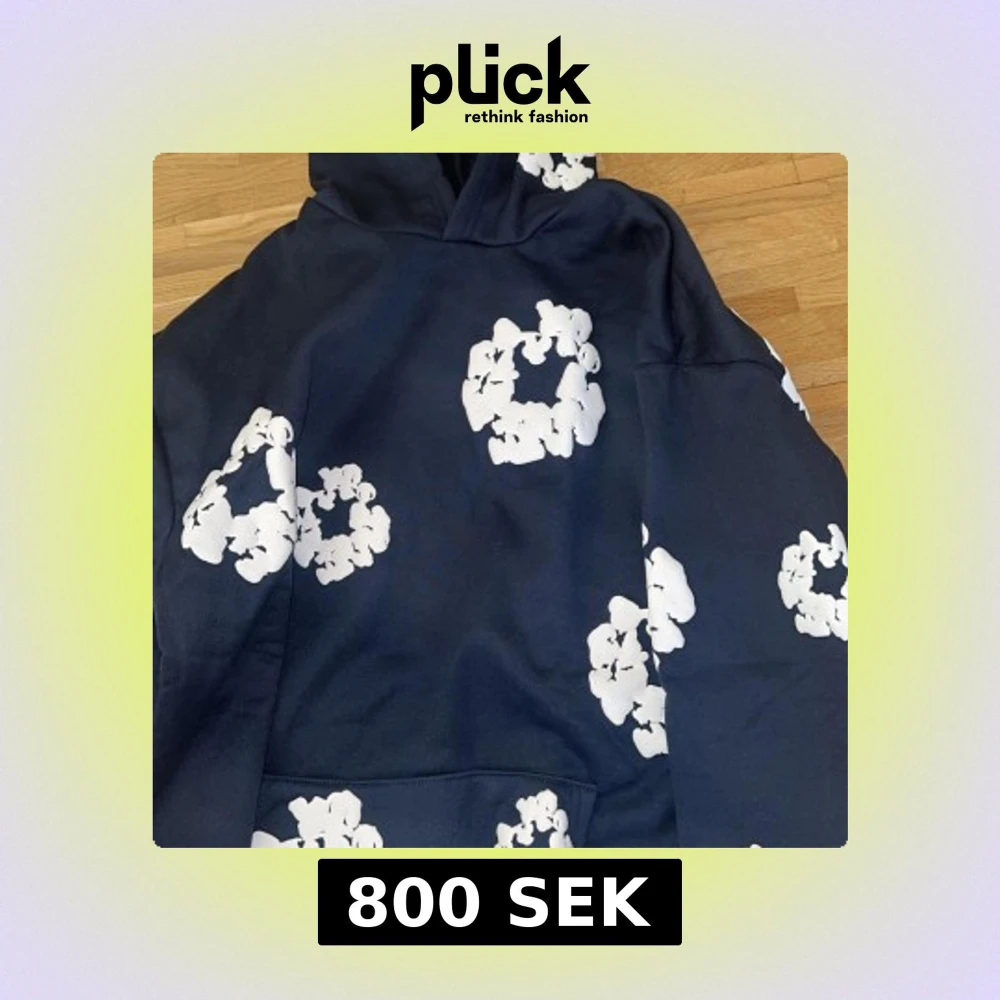 Säljer en mörkblå hoodie med stora vita blommönster över hela tröjan. Tröjan har huva och magficka, samt långa ärmar. Perfekt för dig som gillar en unik och trendig stil.