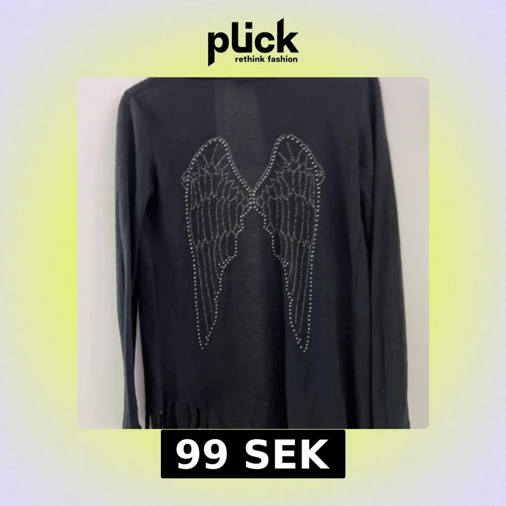 Svart långärmad kofta med coola vingmotiv i silverfärgade nitar på ryggen. Koftan har en öppen front och fransar nedtill som ger en edgy vibe. Perfekt för dig som gillar att sticka ut med detaljer och vill ha något extra till din outfit.