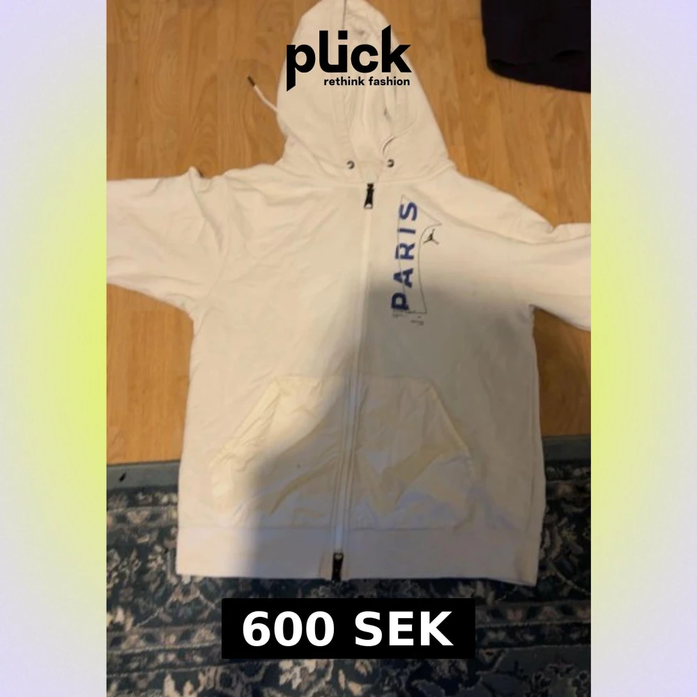 Säljer en vit hoodie från Jordan x PSG med blått PARIS-tryck på bröstet och logga på ärmen. Tröjan har huva med snörning, två fickor fram och hel dragkedja. Perfekt för dig som gillar sportig streetstyle och vill sticka ut med en unik collab.