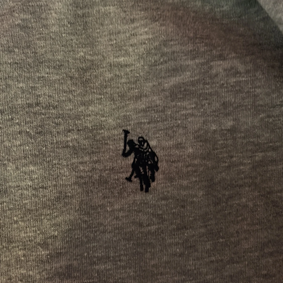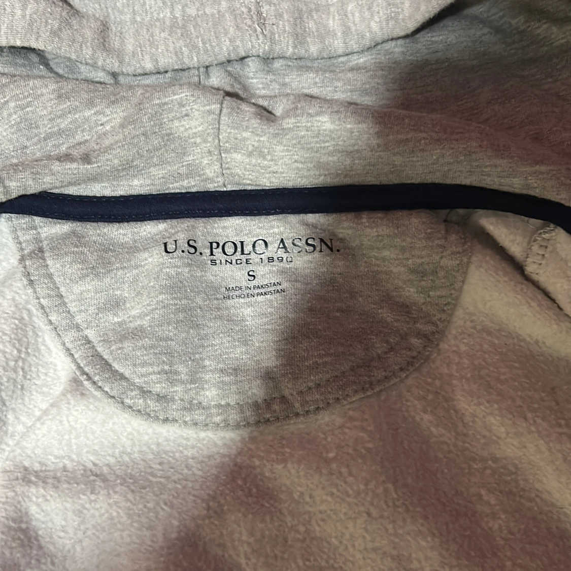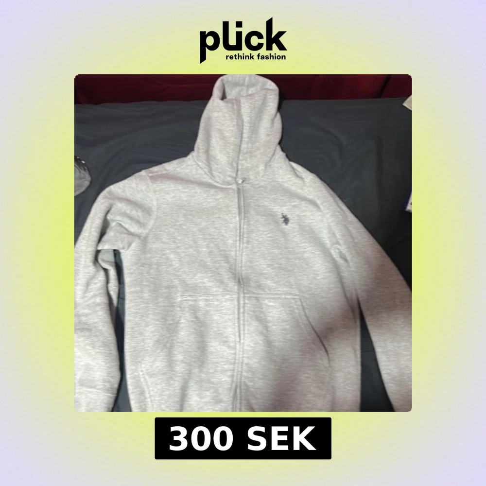 Säljer en ljusgrå hoodie från U.S. Polo Assn. med dragkedja och huva. Tröjan har en liten broderad logga på bröstet och är tillverkad i mjukt bomullsmaterial. Perfekt för en avslappnad stil.
