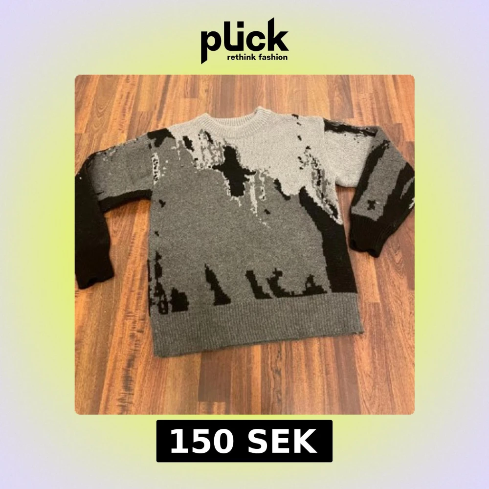 Säljer en stickad tröja i grått och svart med abstrakt mönster. Tröjan har rund halsringning, ribbade muddar och lång ärm. Perfekt för dig som gillar en unik och cool stil med streetkänsla.