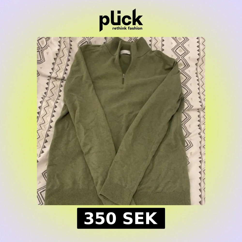 Säljer en stilren olivgrön tröja. Tröjan har långa ärmar och ribbade muddar vid ärmslut och nederkant. Storlek S