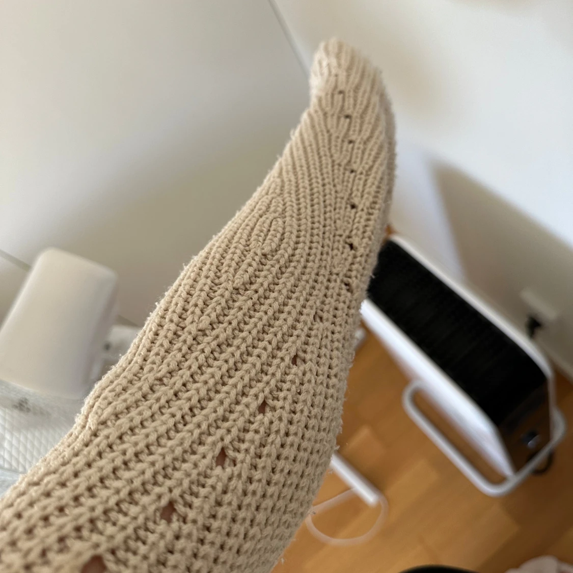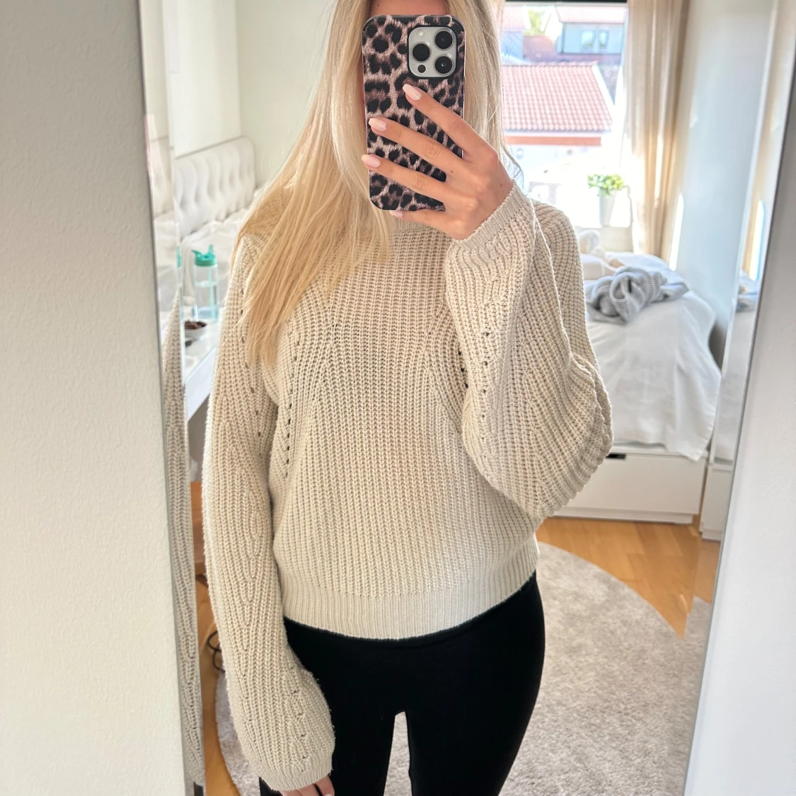 Säljer en supermysig beige stickad tröja med långa ärmar. Perfekt för höst och vinter! Den har ett snyggt mönster och är riktigt skön att ha på sig.