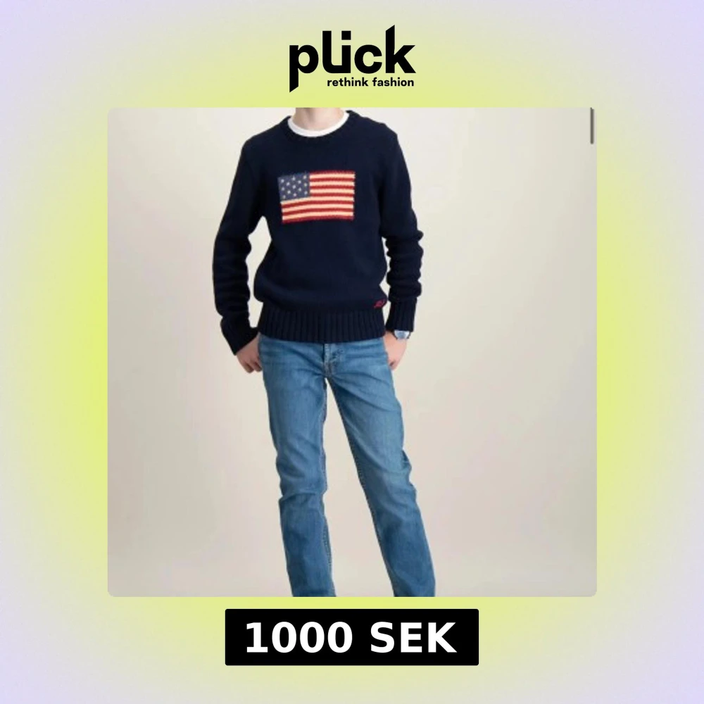 Snygg mörkblå stickad tröja med en stor amerikansk flagga på bröstet. Tröjan har långa ärmar och ribbade muddar vid ärmslut och nederkant. Perfekt för en .avslappnad stil.