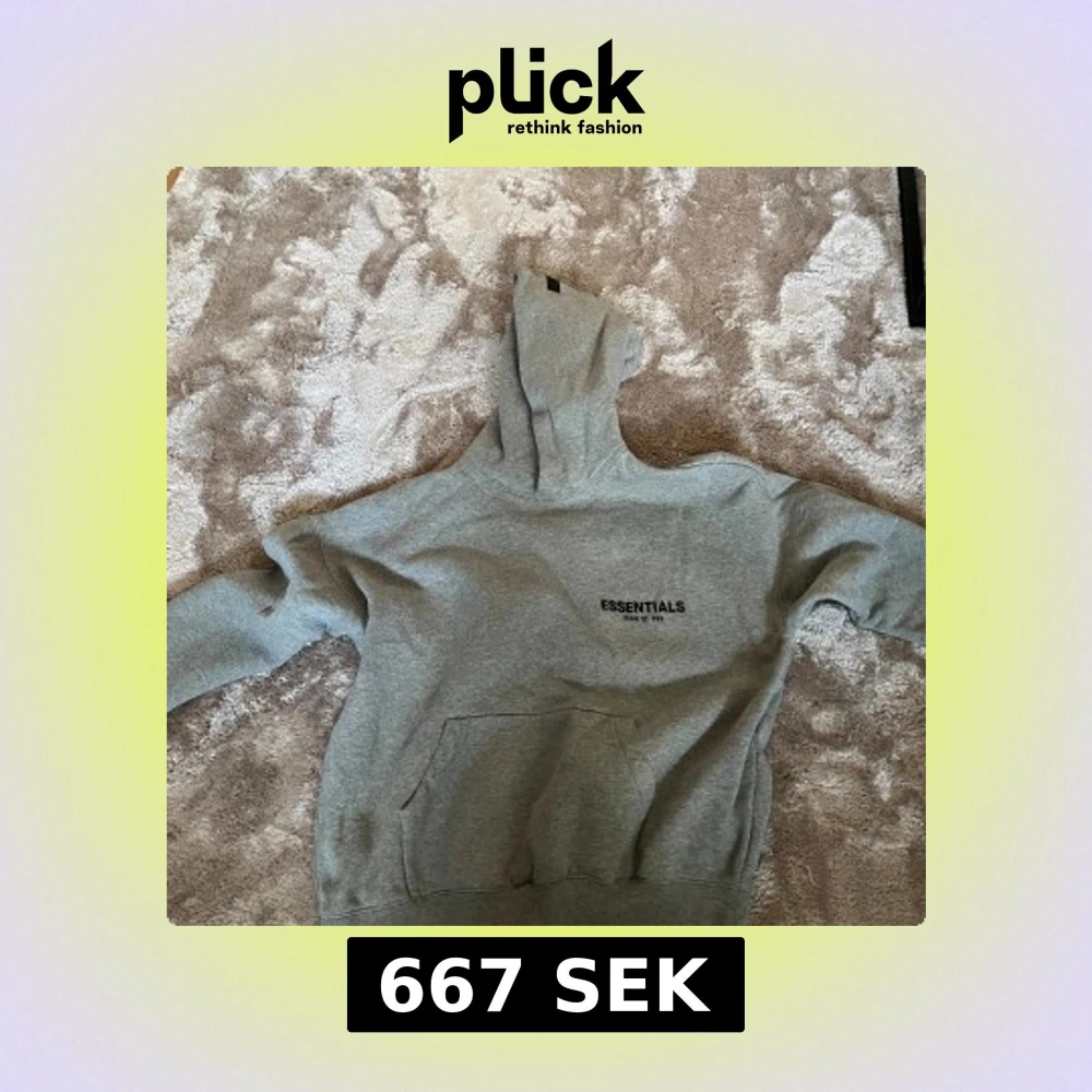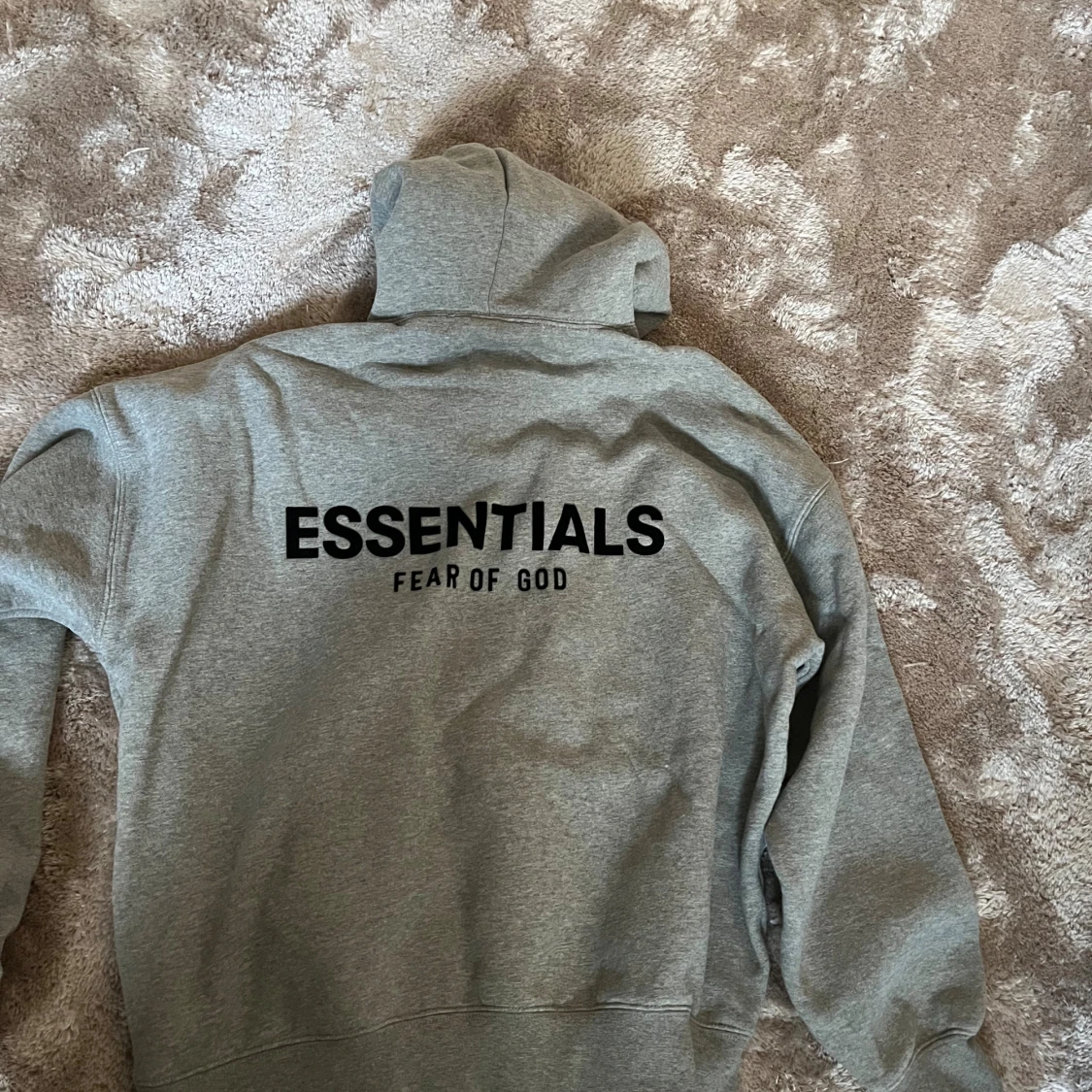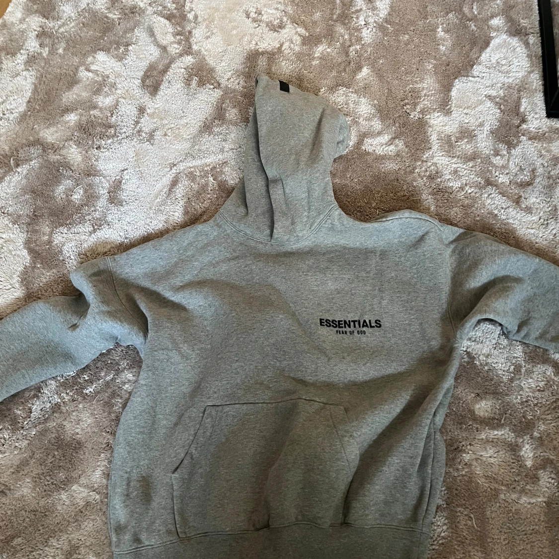 Säljer en grå hoodie från Essentials Fear of God med svart logga på bröstet och ryggen. Storlek S, nästan helt ny andledning vrf den säljs är eftersom den inte passar, skriv gärna vid funderingar