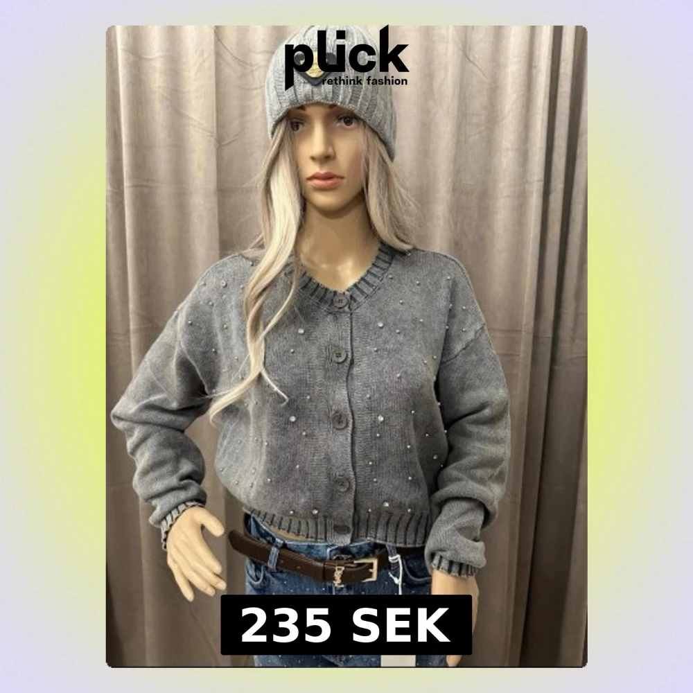 Trendig grå kofta med rund halsringning och stora knappar framtill. Koftan är dekorerad med små pärlor över hela plagget och har ribbade muddar vid ärmslut och nederkant. Perfekt för lager-på-lager och en snygg vardagslook.