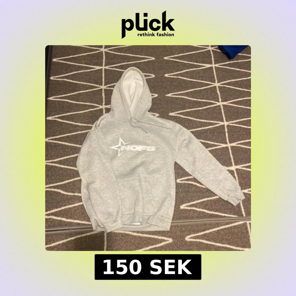 Säljer en ljusgrå hoodie från NOFS med vit stjärnlogga och text på bröstet. Tröjan har huva med dragsko och en stor magficka. Perfekt för dig som gillar en avslappnad och stilren look.