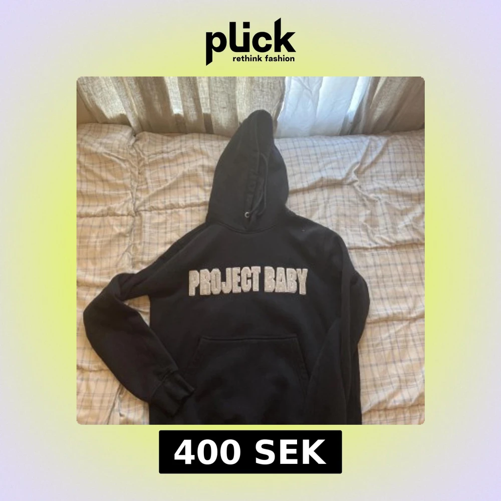 Svart hoodie med stor vit broderad text 'PROJECT BABY' på bröstet. Klassisk känguruficka framtill och huva med snörning. Perfekt för dig som gillar streetwear och vill ha en bekväm och stilren tröja.