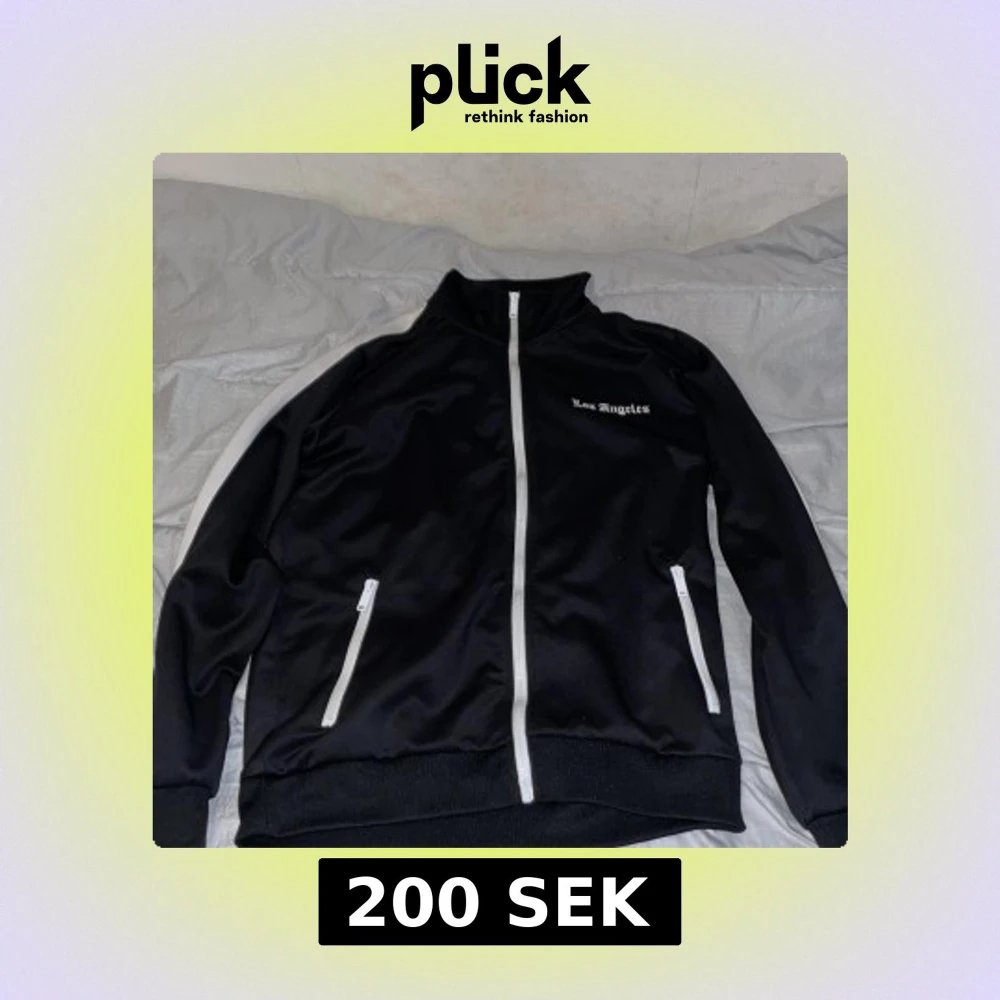 Svart kofta från Black Squad med vita detaljer och dragkedjor. Kofta har ståkrage, vita ränder längs ärmarna och texten 'Los Angeles' broderad på bröstet. Perfekt för en sportig och chill stil.