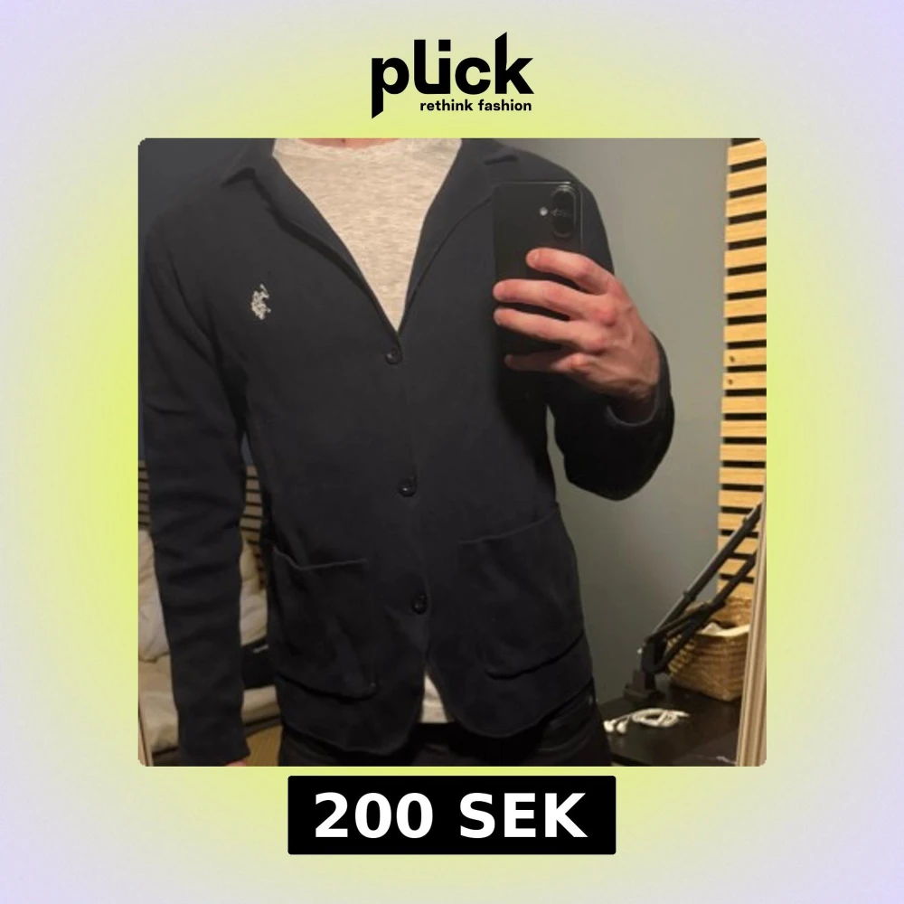 Säljer en stilren mörkblå kofta från U.S. Polo Assn. med klassisk krage, knäppning framtill och två fickor. Broderad logga på bröstet i vitt. Perfekt för lager-på-lager och passar till det mesta.