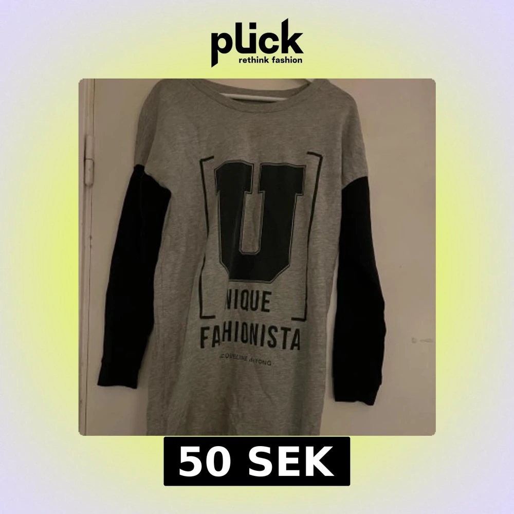 Snygg grå långärmad tröja/ klänning med svarta ärmar och stort tryck framtill med texten 'Unique Fashionista'. Perfekt för en chill och trendig look. Mjuk bomullskänsla och relaxed passform.