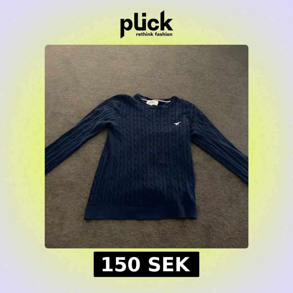 Säljer en mörkblå kabelstickad tröja från Hampton Republic med broderad logga på bröstet. Tröjan har rund halsringning och långa ärmar, perfekt för en stilren look. St 170