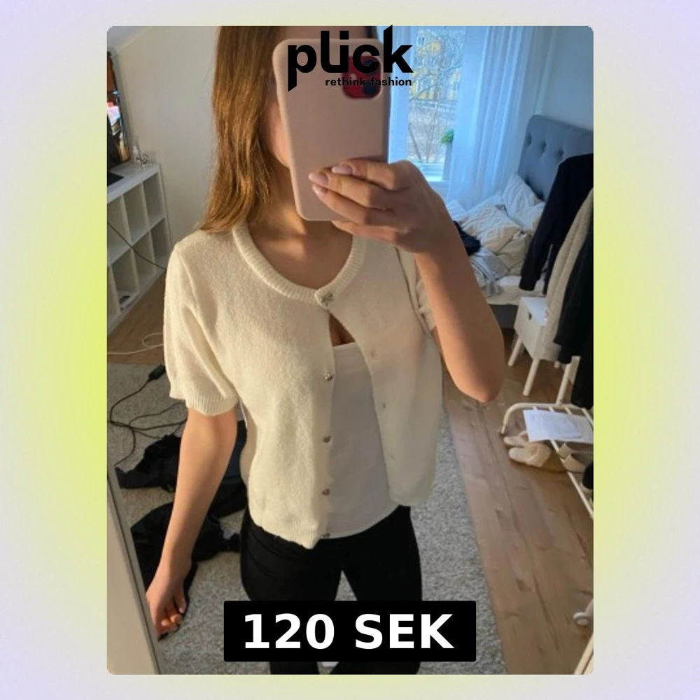 Söt vit kofta med korta ärmar och rund halsringning. Koftan har silvriga knappar framtill och är gjord i ett mjukt, stickat material, storlek 170💗