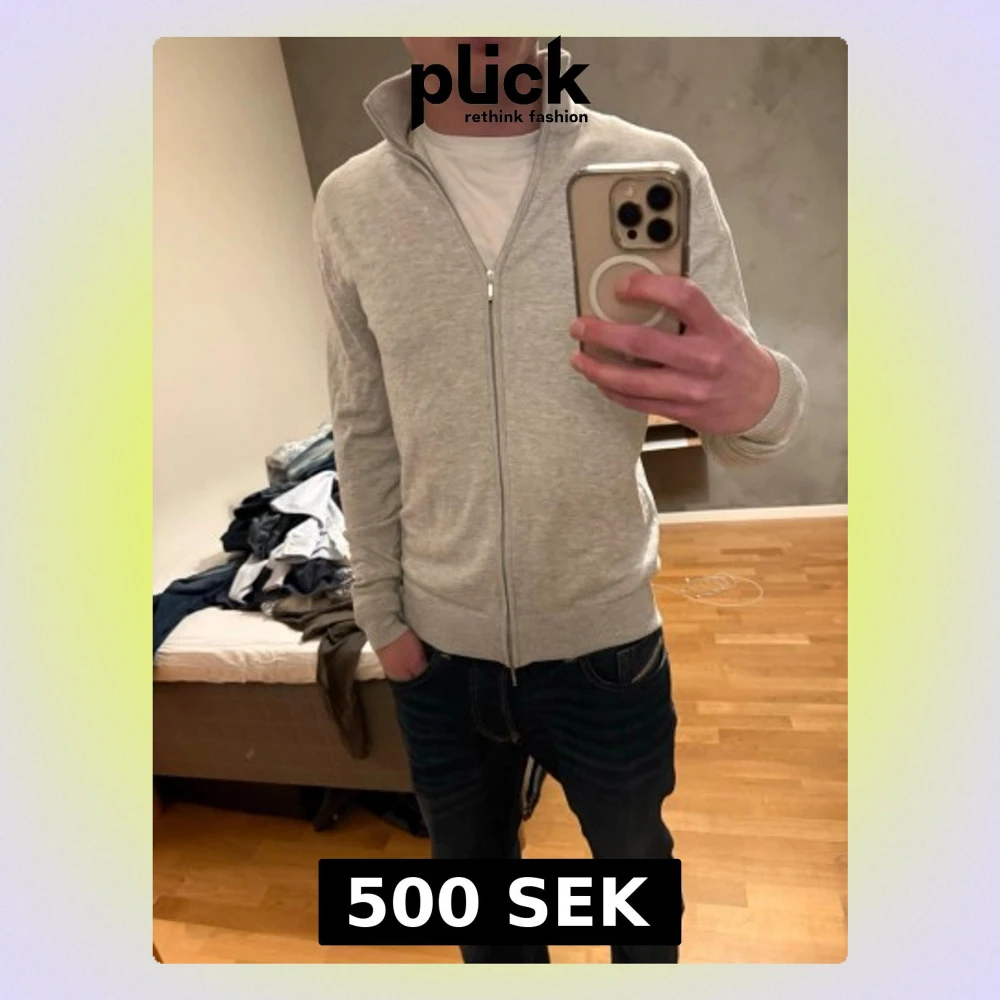 Ljusgrå kofta från Suitsupply i storlek S, tillverkad av en lyxig mix av silke, ull och kashmir. Modellen har hel dragkedja framtill, ribbade muddar och hög krage. Perfekt för dig som gillar stilrena och mjuka plagg med premiumkänsla.