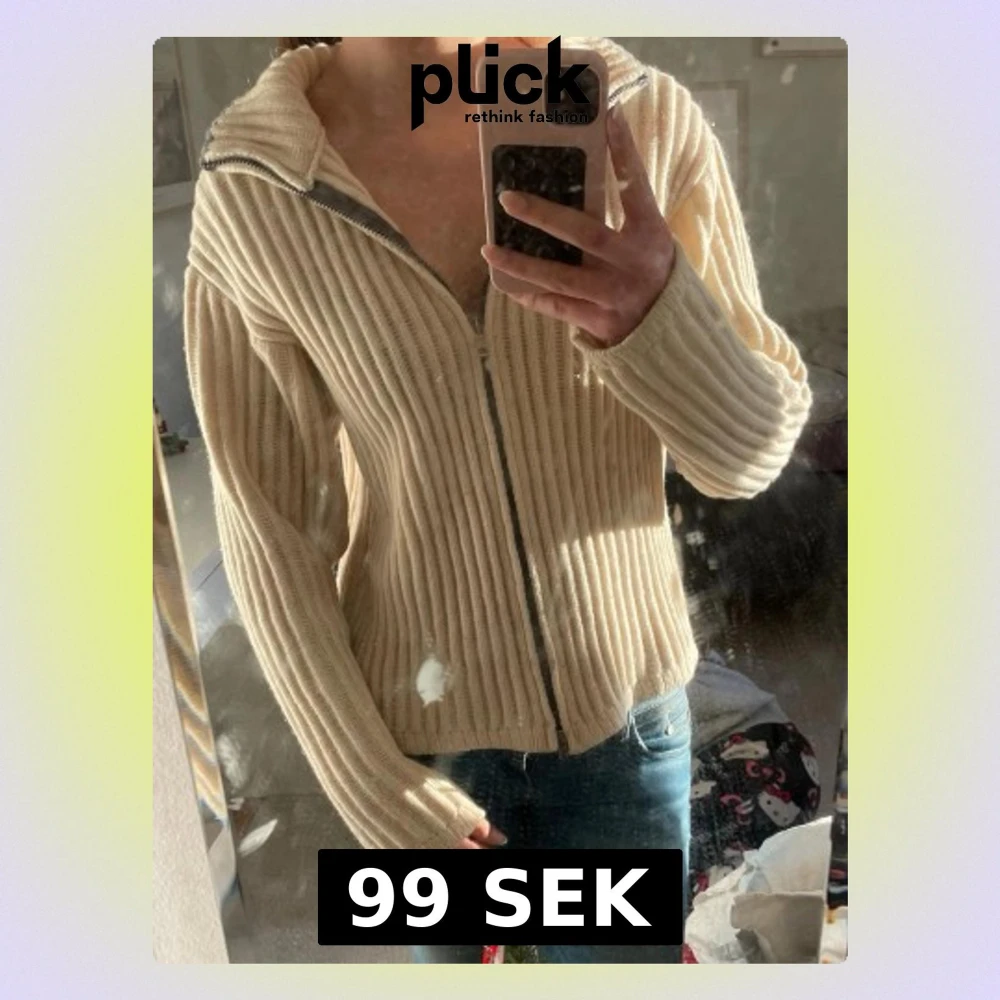 Säljer en beige ribbstickad kofta med hel dragkedja framtill och hög krage med grå kant. Vet inte exakta storleken men skulle säga att den passar S/M