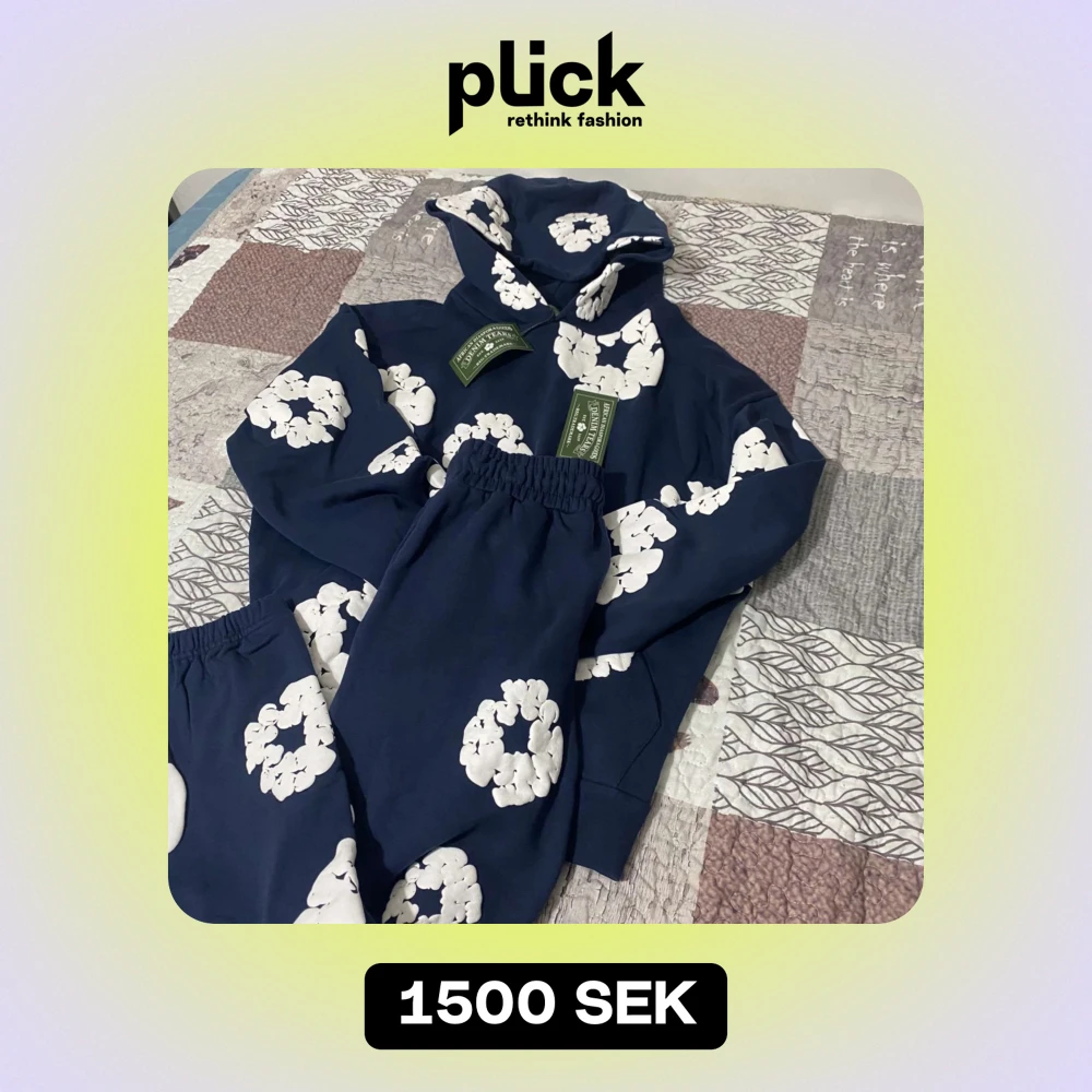 Säljer ett set med en mörkblå hoodie och matchande byxor, båda med stora vita blommor. Hoodien har en klassisk passform med långa ärmar och en bekväm huva. Byxorna har elastisk midja för extra komfort. Perfekt för en avslappnad stil eller mysiga dagar hemma.