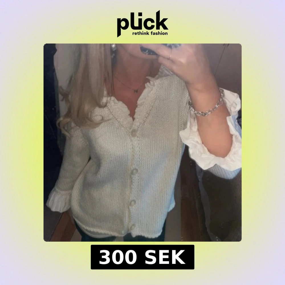 Superfin vit stickad kofta med volangdetaljer. Köpt utomlands och använd några få gånger och i väldigt bra skick! Står ingen storlek i men skulle säga att den passar S/M💕