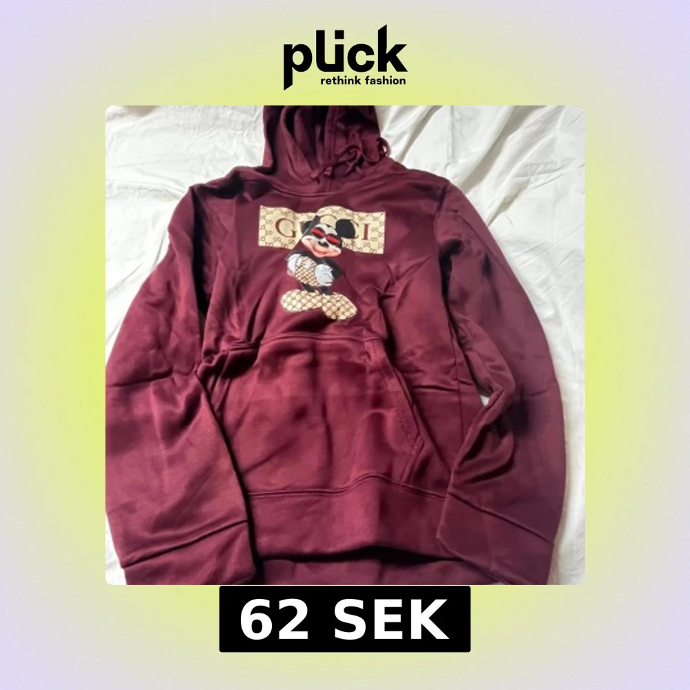 Säljer en vinröd hoodie med stort tryck. Tröjan har huva med snörning och en stor magficka. Perfekt för dig som vill sticka ut med en unik och trendig look.