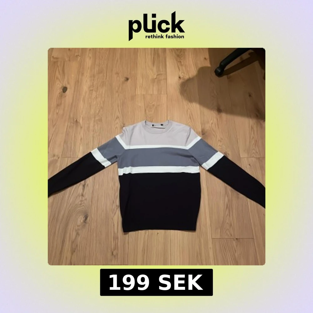 Snygg långärmad tröja med breda horisontella ränder i ljusgrått, blått, vitt och mörkblått. Tröjan har en klassisk rund halsringning och är perfekt för dig som gillar stilrena färgblock. Passar till jeans eller chinos för en clean look.