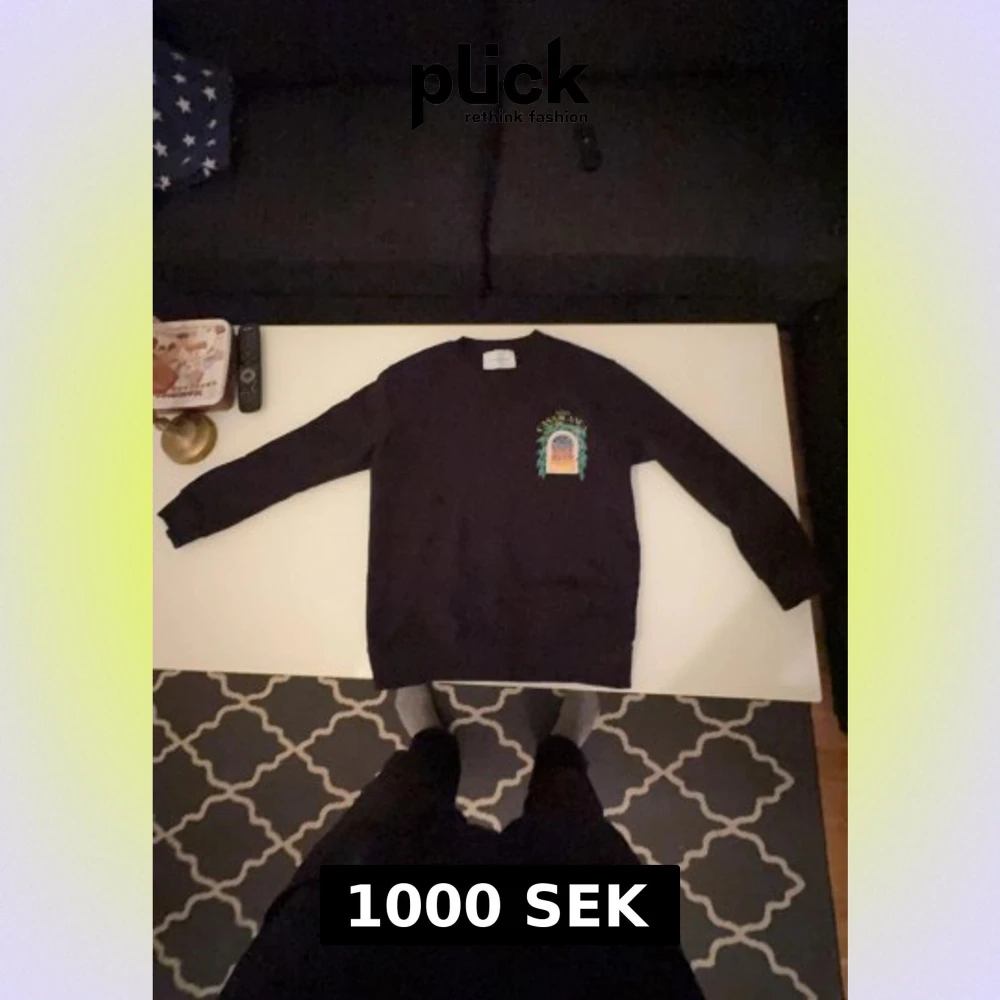 Svart sweatshirt från Casablanca med färgglad tryckt grafik på bröstet och ryggen. Motivet visar en byggnad med gröna blad och texten 'Avenida Casablanca' i gult. Tröjan har rund hals och långa ärmar, perfekt för dig som gillar unika prints och streetwear. Säljer denna underbara tröja från Cassablanca vill sälja den då jag har råkat krympa till den originals storleken är storlek S men funkar nu som storlek XS. Säljer den för 1000 kr men pris kan diskuteras vid snabba affärer!