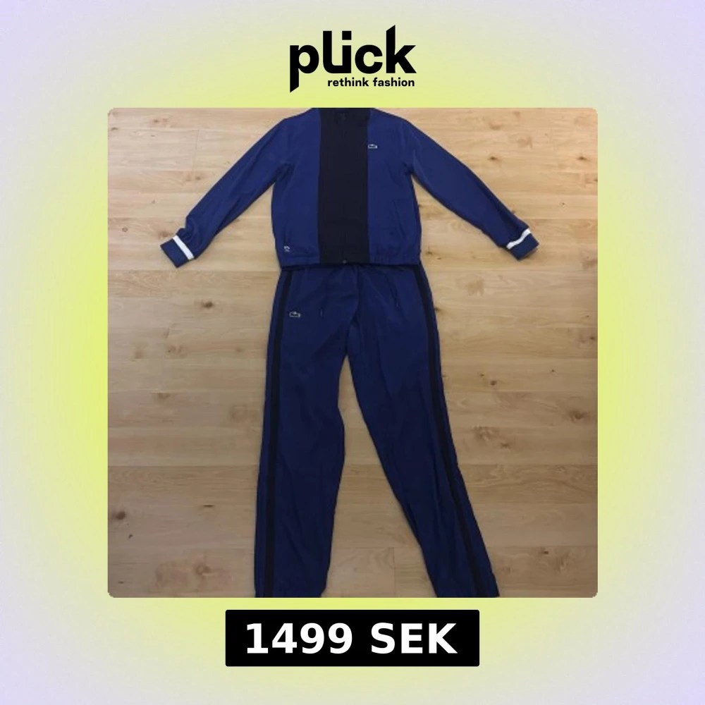 Snyggt blått träningsset från Lacoste Sport med svart panel på jackan och byxorna. Jackan har vit LACOSTE-tryck på ryggen och klassisk krokodillogga fram. Byxorna har snörning i midjan och svarta ränder längs benen. Perfekt för dig som gillar sportig stil. 9/10 skick använd väldigt få gånger säljer för att de blivit för litet