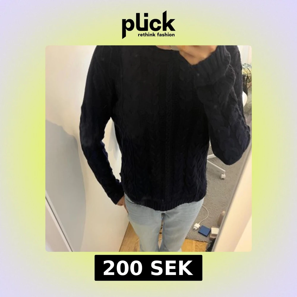 Mörkblå stickad tröja från Etirel Heritage Collection i storlek S. Tröjan har ett klassiskt flätstickat mönster, rund hals och långa ärmar. Den är lite längre baktill. Jättefint plagg nu till hösten och vintern