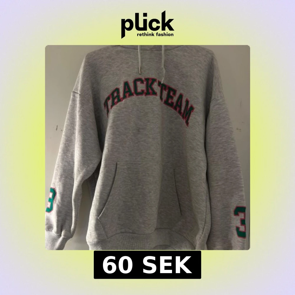 Säljer en grå hoodie med texten 'TRACKTEAM' i rosa och grönt på framsidan. Tröjan har en stor ficka framtill och en justerbar huva med snören.