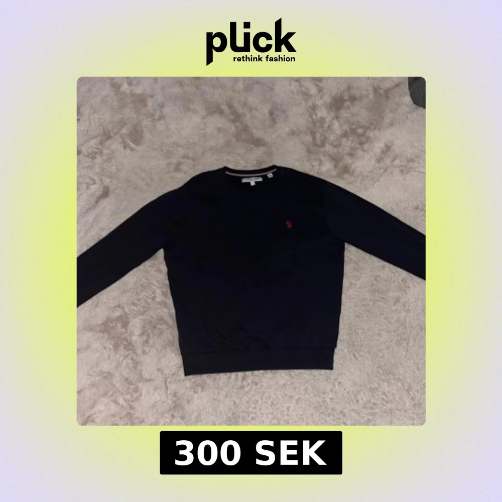 Snygg svart/mörkblå tröja från La Polo Assn med ett rött broderat emblem på bröstet. Tröjan har långa ärmar och en klassisk rund halsringning. Perfekt för en stilren look. Tröjan är använd tre gånger och är perfekt passform i storlek S och är riktigt skön och varm.