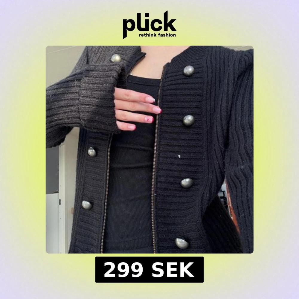 Snygg svart ribbad kofta med stora dekorativa knappar och dragkedja framtill. Perfekt för lager-på-lager och ger en stilren look. Passar bra till både vardag och mer uppklädda tillfällen.