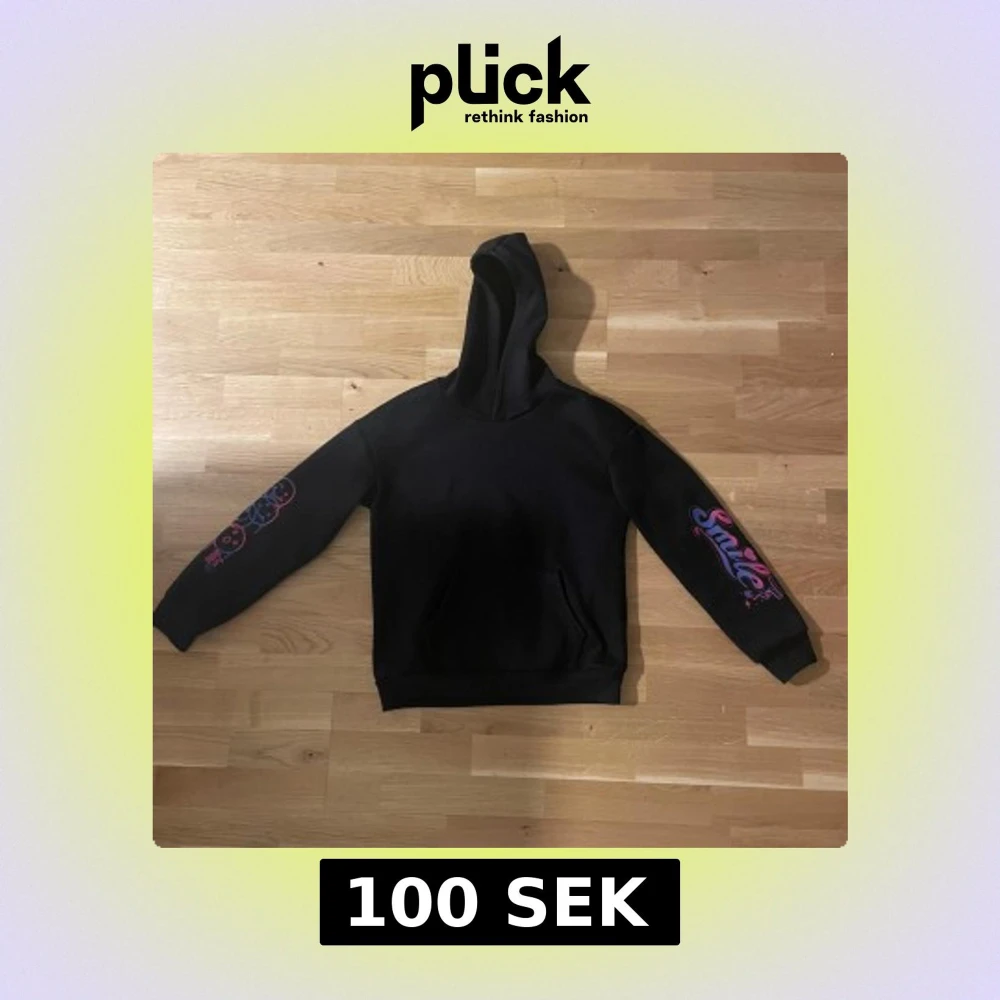 Säljer en svart hoodie med tryck på ärmarna och ryggen. Ena ärmen har texten 'Smile!' i rosa och blått, andra har smileys och texten 'fun babe'. På ryggen finns ett stort tryck med ett leende ansikte och texten 'Happy Smile'. Perfekt för dig som gillar streetwear.