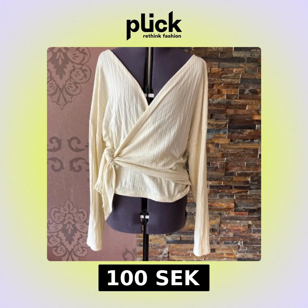 Krämvit ribbad omlottopp från NLY Trend i storlek S. Toppen har långa ärmar, v-ringning och knyt i sidan. Knapp i ena sidan. Sömmen har släppt lite på ett ställe, lätt att laga (se bild)