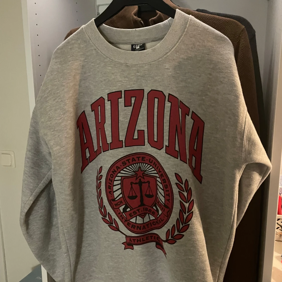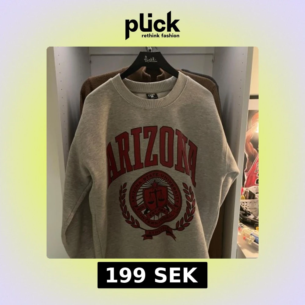 Snygg grå sweatshirt från FSBN i relaxed fit med stort rött Arizona State University-tryck framtill. Klassisk rund halsringning och långa ärmar. Perfekt för dig som gillar college-stil och vill ha en bekväm och trendig tröja. Storlek S. Aldrig använd