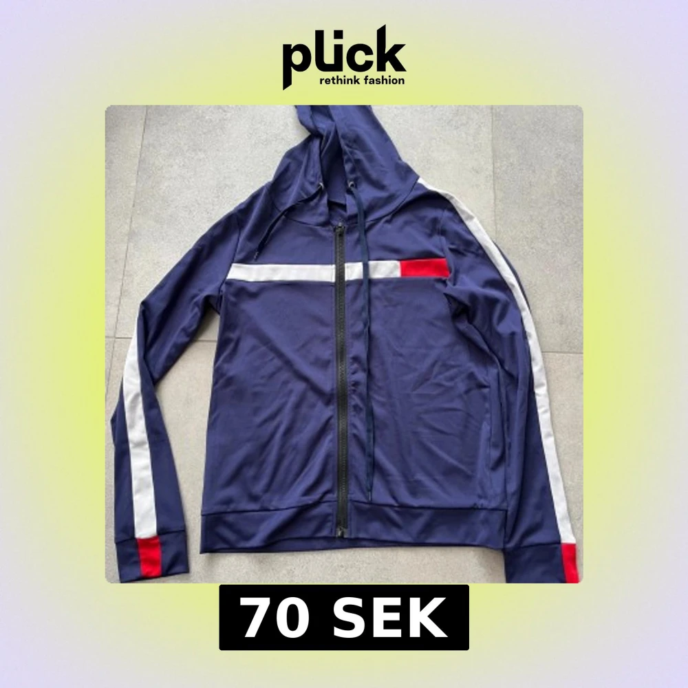 Sportig blå vindjacka med huva, hel dragkedja och vita samt röda detaljer längs ärmar och bröst. Jackan har en clean look med smala ränder och är perfekt för en chill streetstyle. Materialet är lätt och känns skönt mot huden.